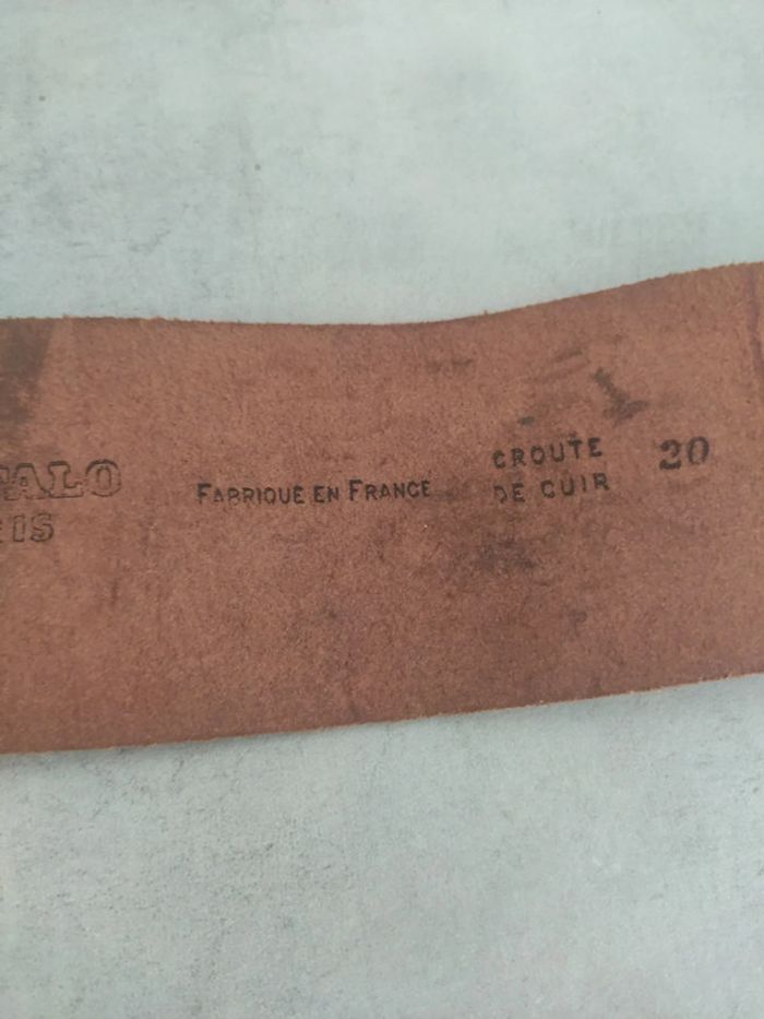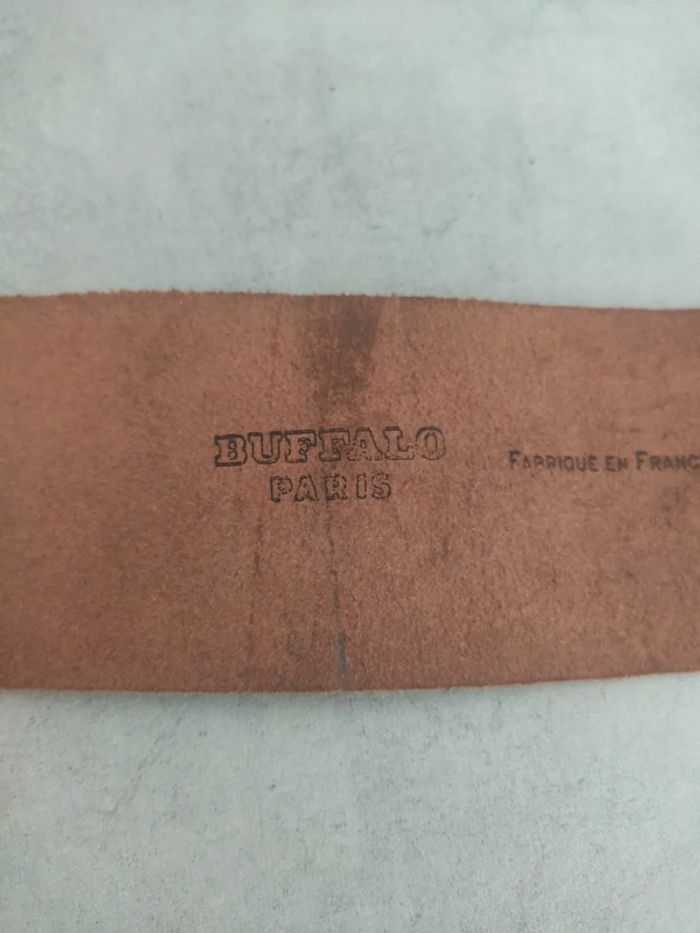 Ceinture acheté dans les années 70 ou 80. Marque Buffalo Paris, en croûte de cuir et fabriqué en France. Légèrement arrondie pour plus de confort. En bon état mais elle a été portée donc il y a forcément des traces d'usure. Boucle rectangulaire en métal. Longueur totale 84 cm, largeur 6 cm