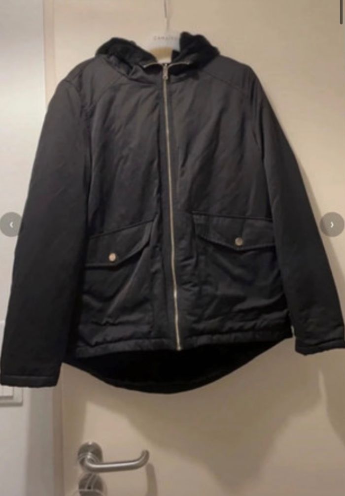 Blouson noir réversible un côté blouson imperméable un côté fourrure douce avec capuche. Marque Camaïeu. Taille 40. Tte bon état.