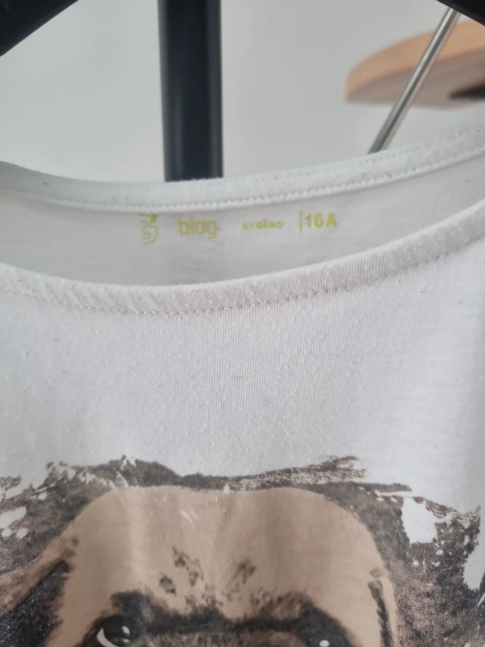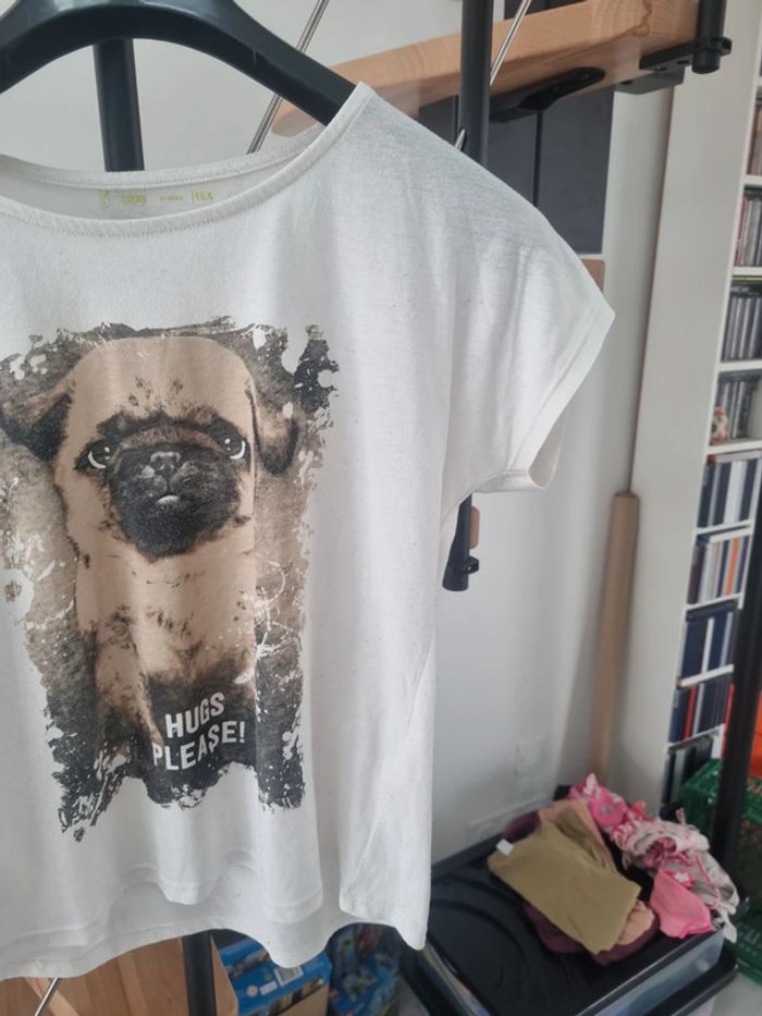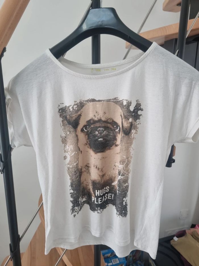 Tee-shirt blanc avec dessin chien , 16 ans, manches courtes , quelques peluches #somara66fille16ans