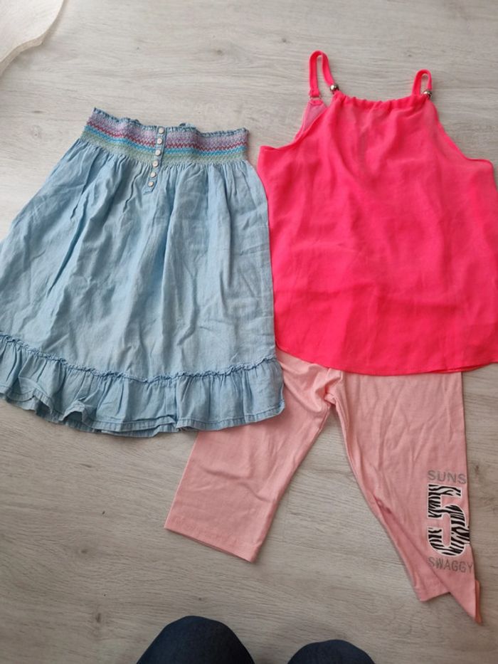 Lot 2 debardeurs et legging court 7 ans, 1 débardeur long en jean, 1 rose en voile. Et legging rose #somara66fille7ans