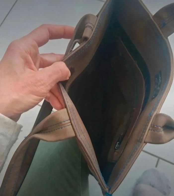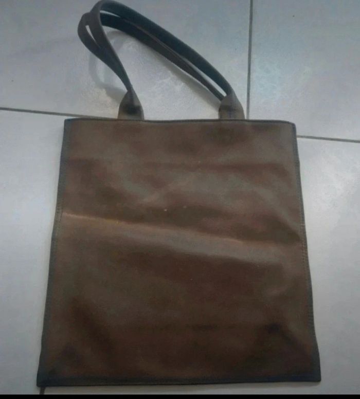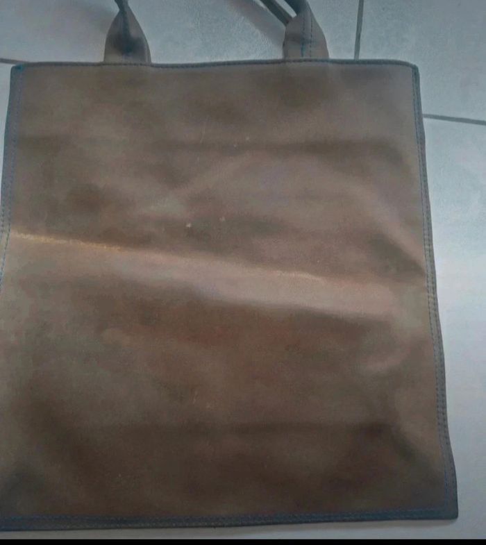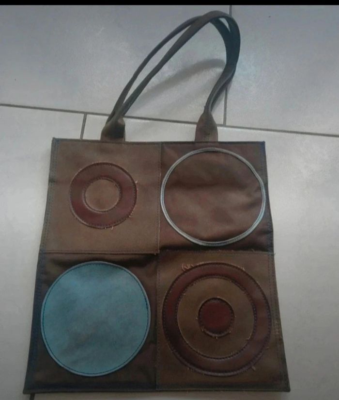 Sac plat fait par créateur indépendant, en imitation cuir et tissu. 35cm sur 32cm. Quelques traces sur le verso du sac #somara66sac