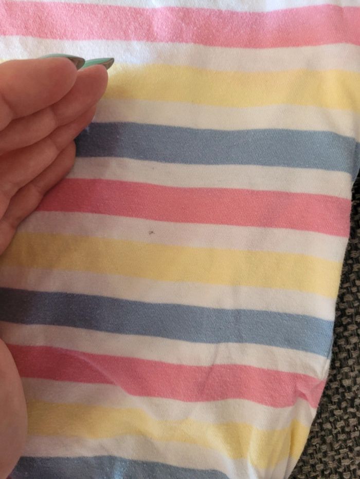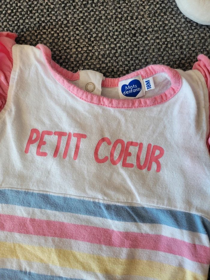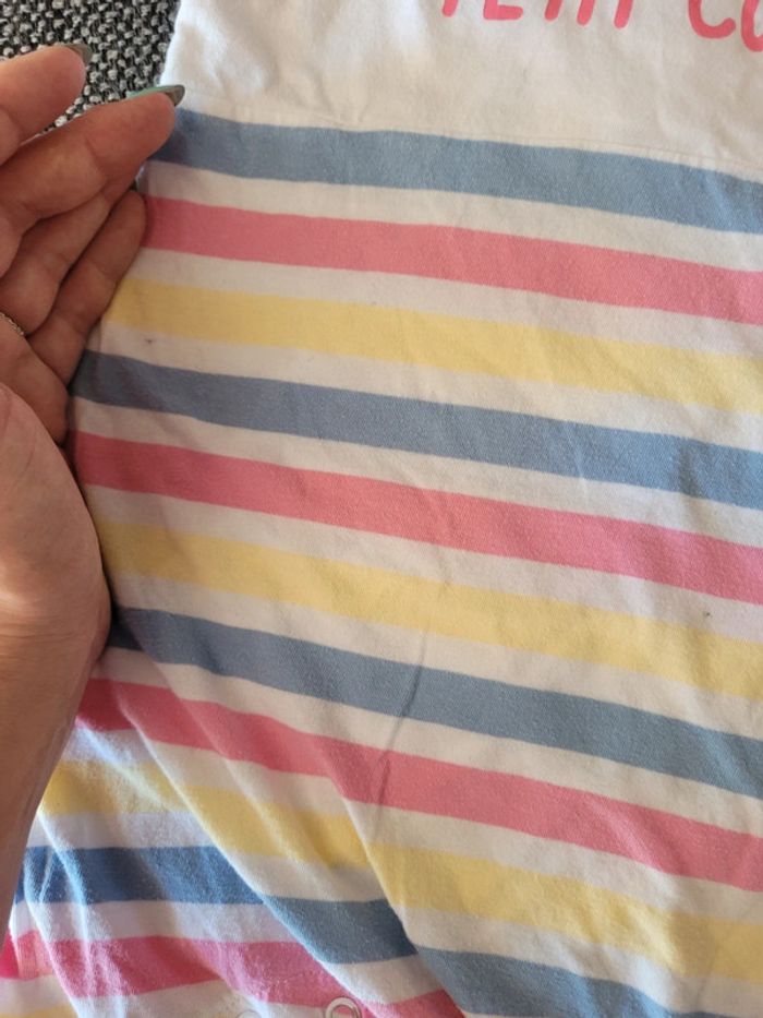 Combishort/barboteuse fille de taille 18 mois et de la marque Mots d'enfants Motif marinière à rayures blanches et multicolores pastel En coton idéale pour l'été Élastiquée aux cuisses Froufrous/volants au niveau des épaules Pressions au niveau de la couche pour faciliter le change Aucun trou. Juste 2 petites tâches à l'avant (voir photos) #mabi38780fille18mois