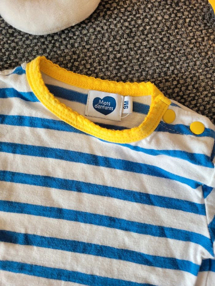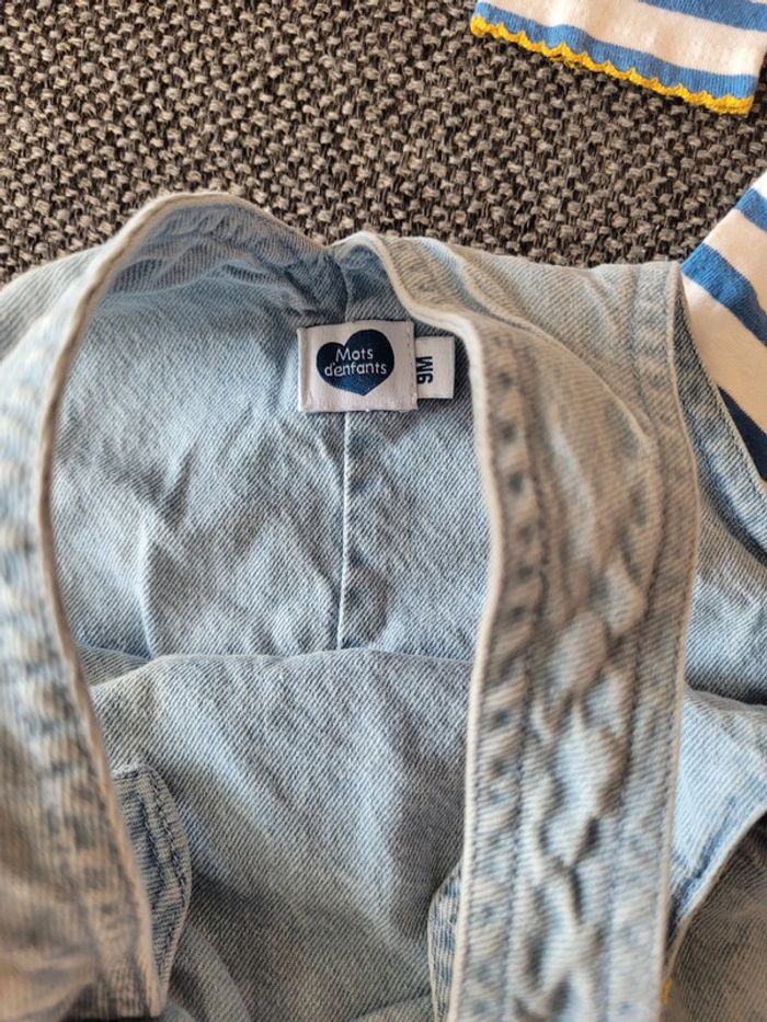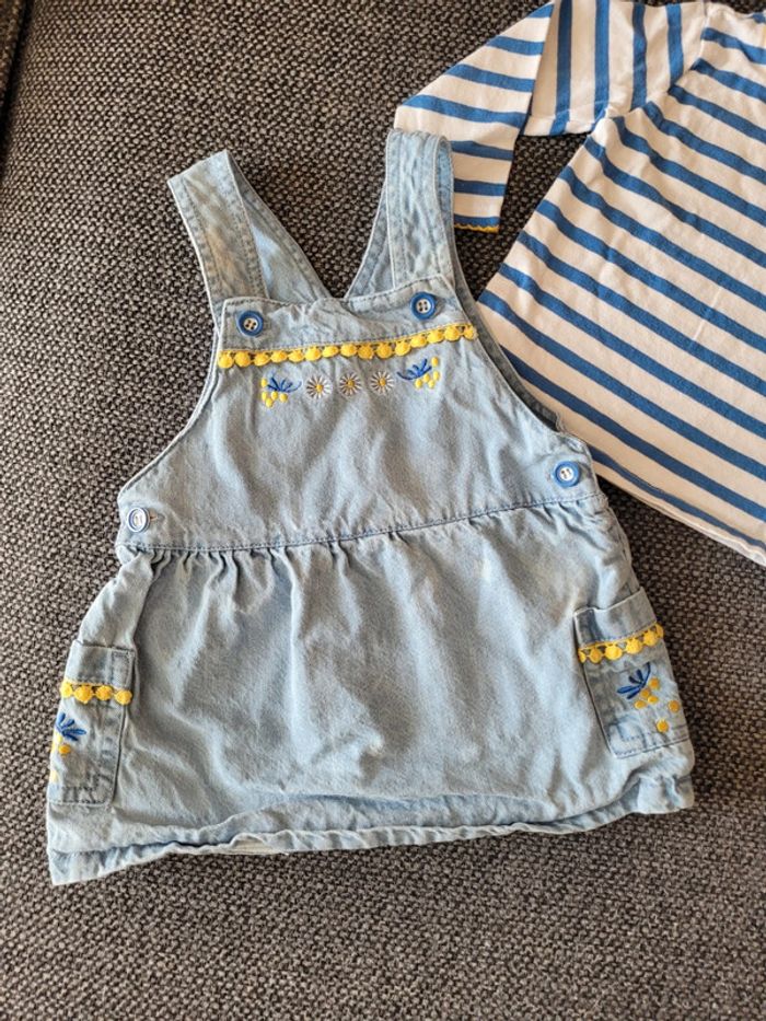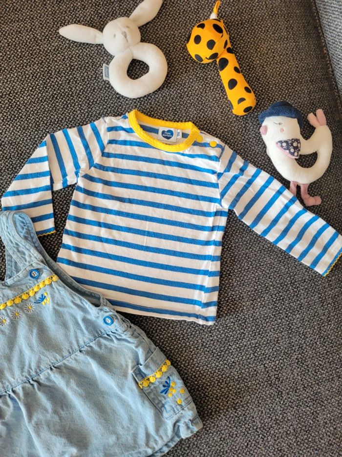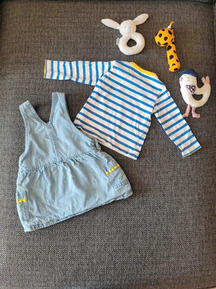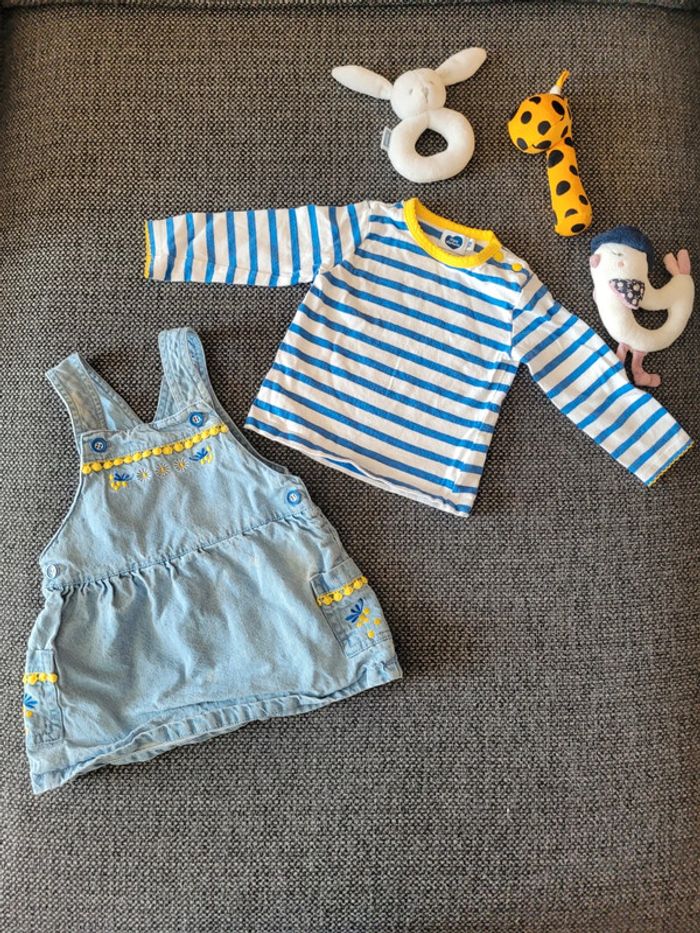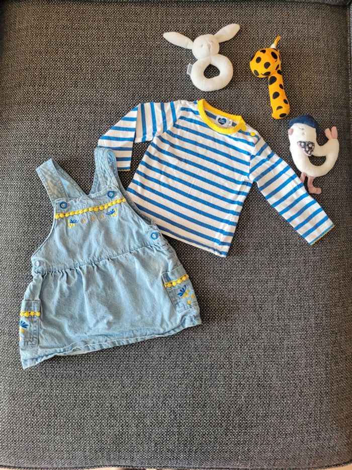 Ensemble pour fille de taille 9 mois et de la marque Mots d'enfants Composé d'un t-shirt à manches longues marinière blanc à rayures bleues + une robe en jean souple assortie Thème mimosa très printanier Aucune tâche, ni trou #mabi38780fille9mois