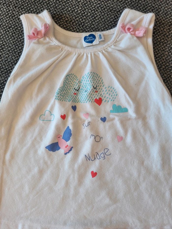 Ensemble pour fille de taille 18 mois et de la marque Mots d'enfants Avec un t-shirt sans manche à écriture "sur mon nuage" et motifs cœurs, oiseaux et nuage Et un legging court arrivant aux genoux assorti avec paillettes En coton stretch, idéal pour les beaux jours Très peu porté Aucune tâche ni trou #mabi38780fille18mois