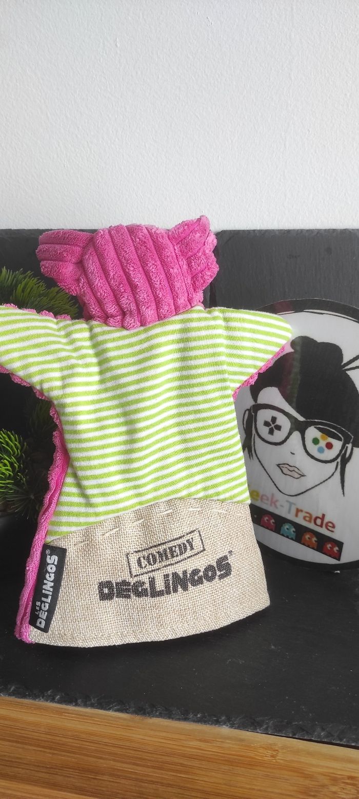 Doudou marionnette Jambonos le cochon les deglingos rose rond etoiles vert Rayé