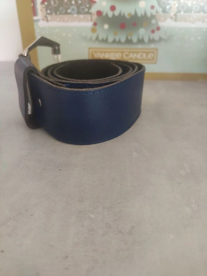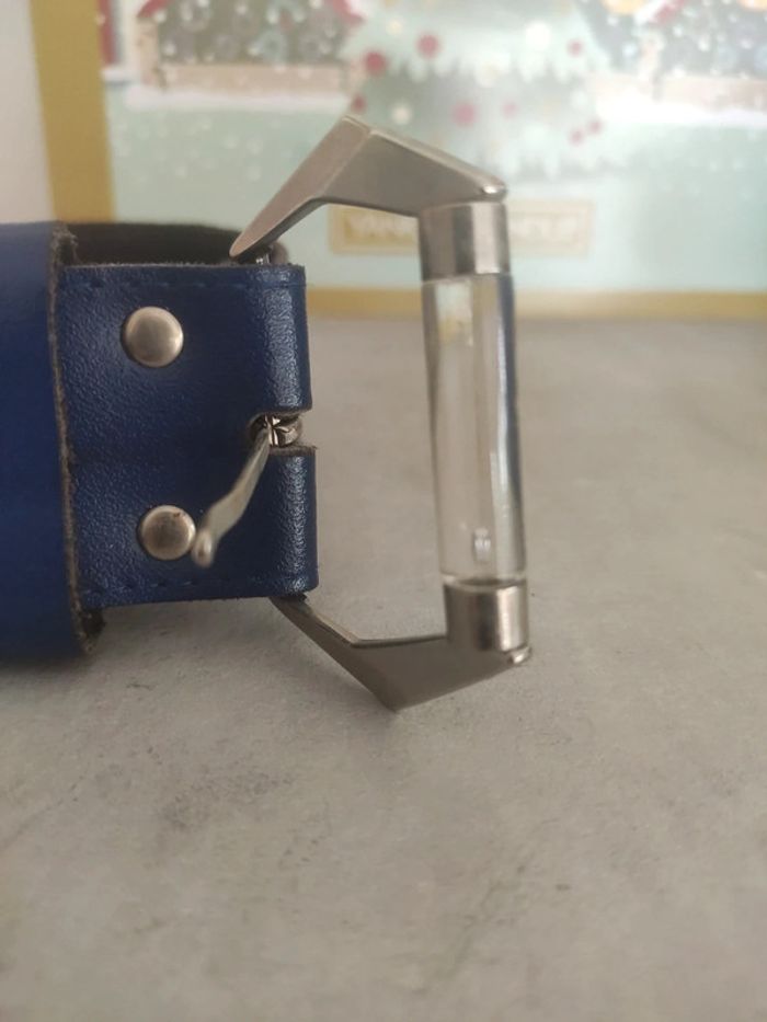 Ceinture toute simple bleu mais boucle originale avec une pièce transparente, achetée au siècle dernier 😂 longueur total 90 cm, largeur 3,7 cm. Je pense qu'elle est en cuir mais je n'en suis pas sûr