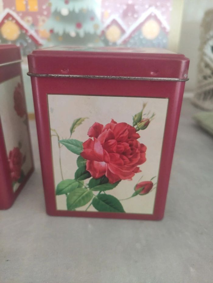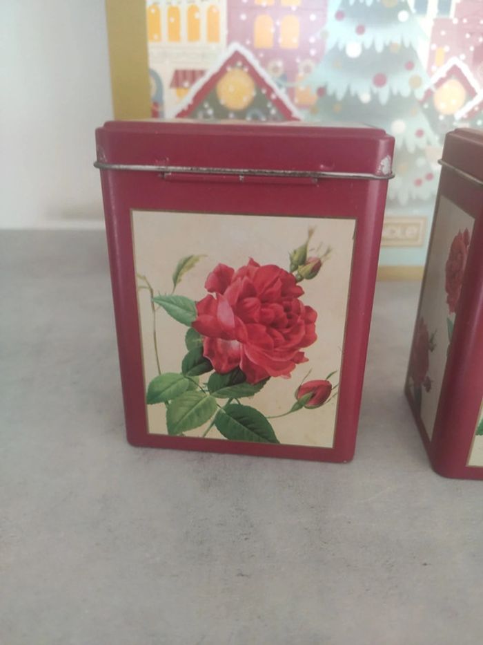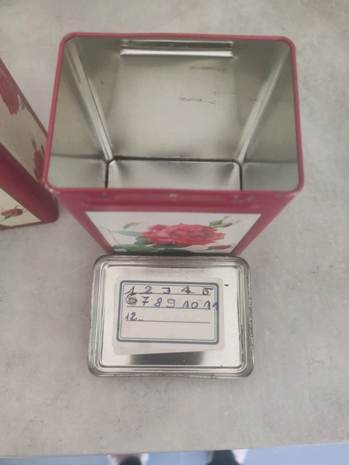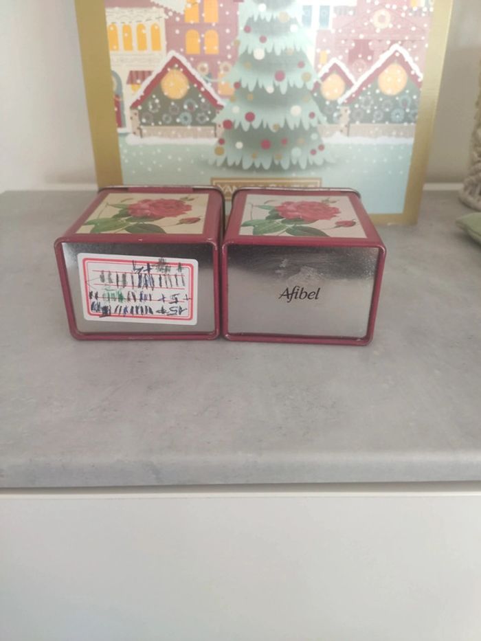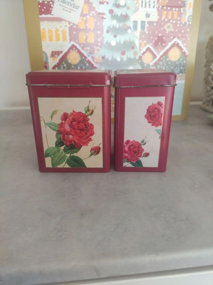 Avec des dessins de roses. Elles ont veilli, il y a un peu de rouille et de nettoyage à faire. Il y a aussi des étiquettes collées en dessous de l'un et sous le couvercle de l'autre, ne se voit pas donc. Il est écrit Afibel sous une boîte. Dimension 10 cm x 5,5 cm x 7,5 cm