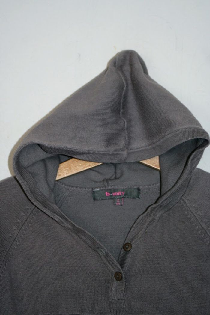 Pull à capuche B-unity gris/beige bien porté donc un peu pelucheux, plusieurs fils tirés cf photos, 140g