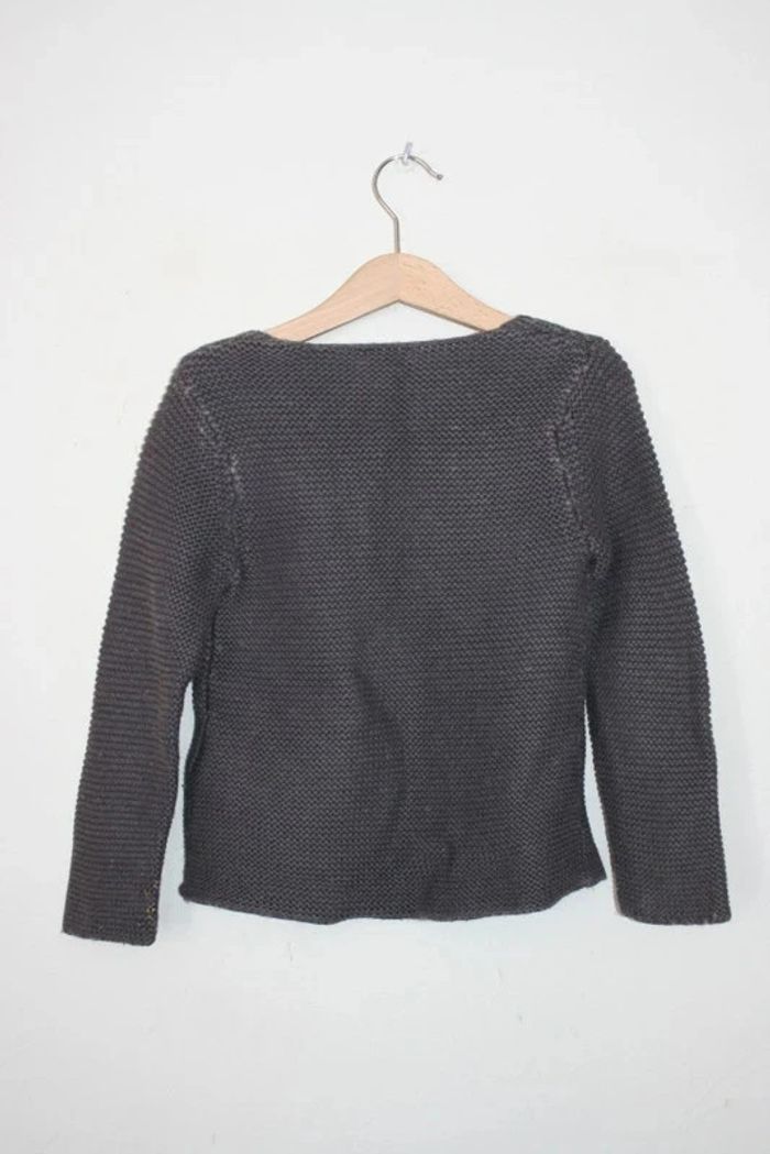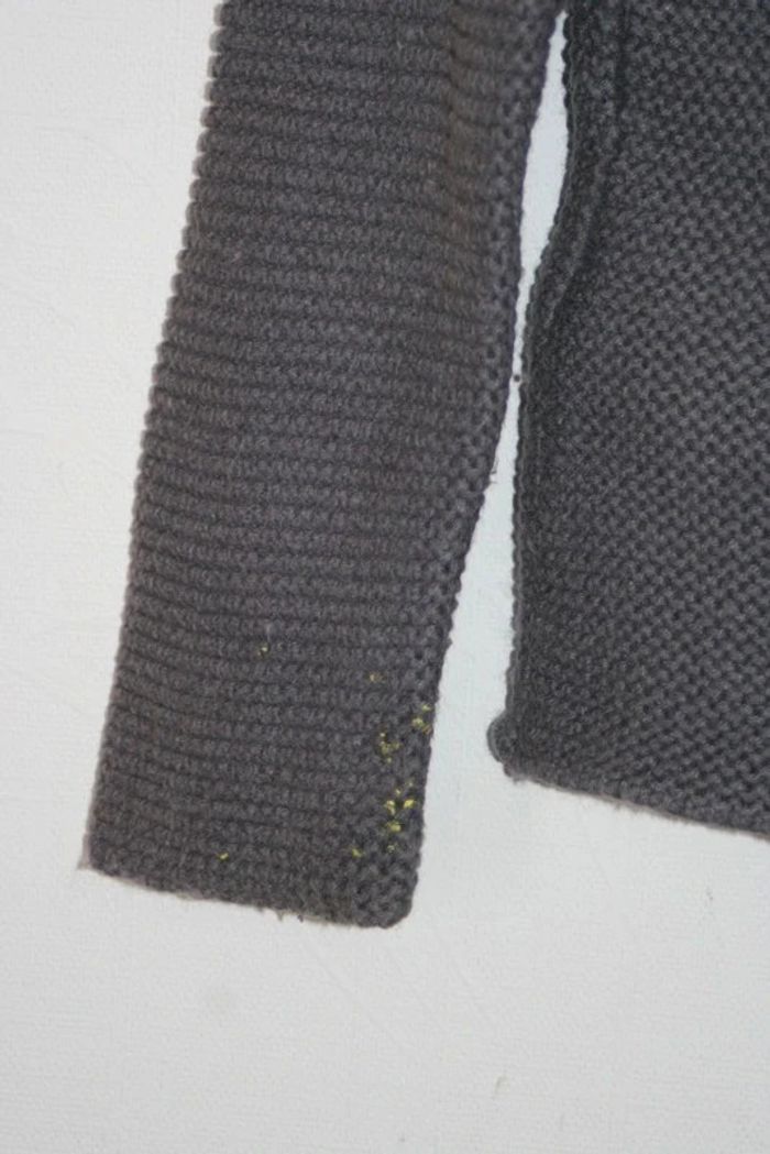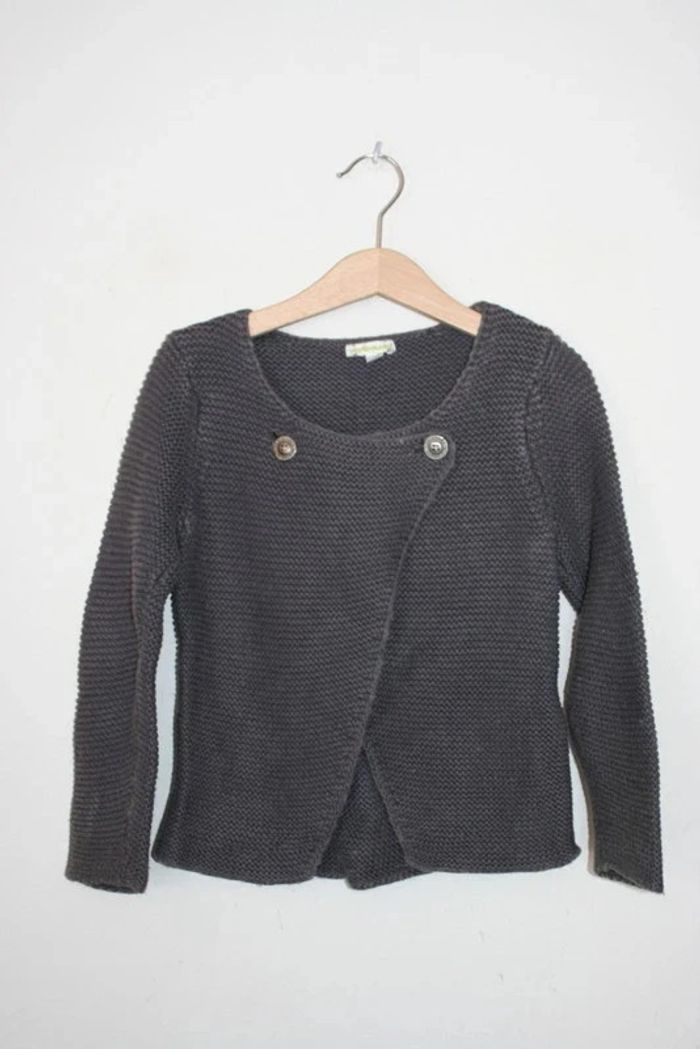 Gilet gris de chez Vert Baudet taille 5 ans, légèrement bouloche, petite tâche de peinture à l'arrière de la manche gauche cf photo, 1 bouton de rechange à l'intérieur, 40% coton/30% viscose/ 25% polyamide/ 5% angora, 300g