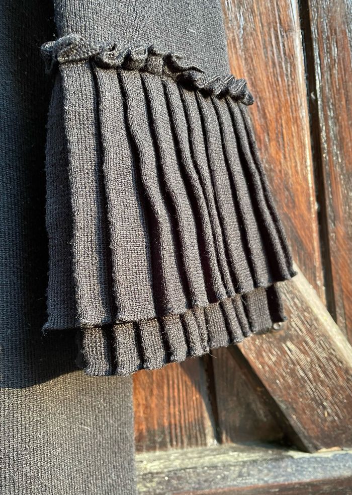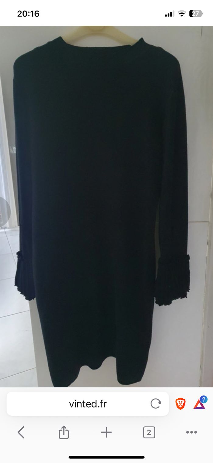 Robe légere noire. Arrive aux genoux. Particularité aux manches doublé et plissé. Marque C&A. Taille poitrine d'aisselle a aisselle 52 cm et 101 cm de haut (voir sur photos) En parfait état.