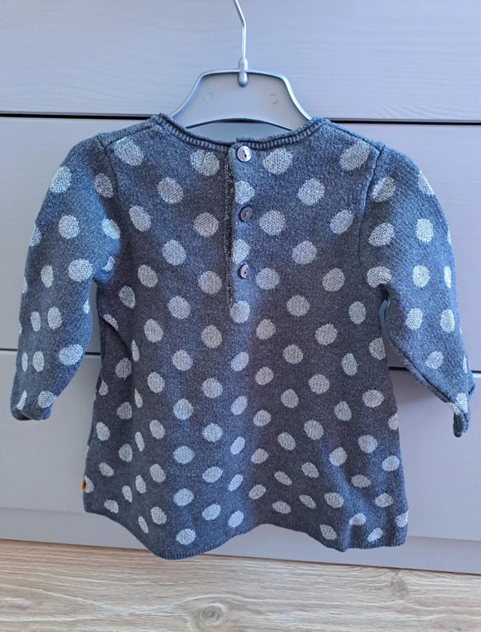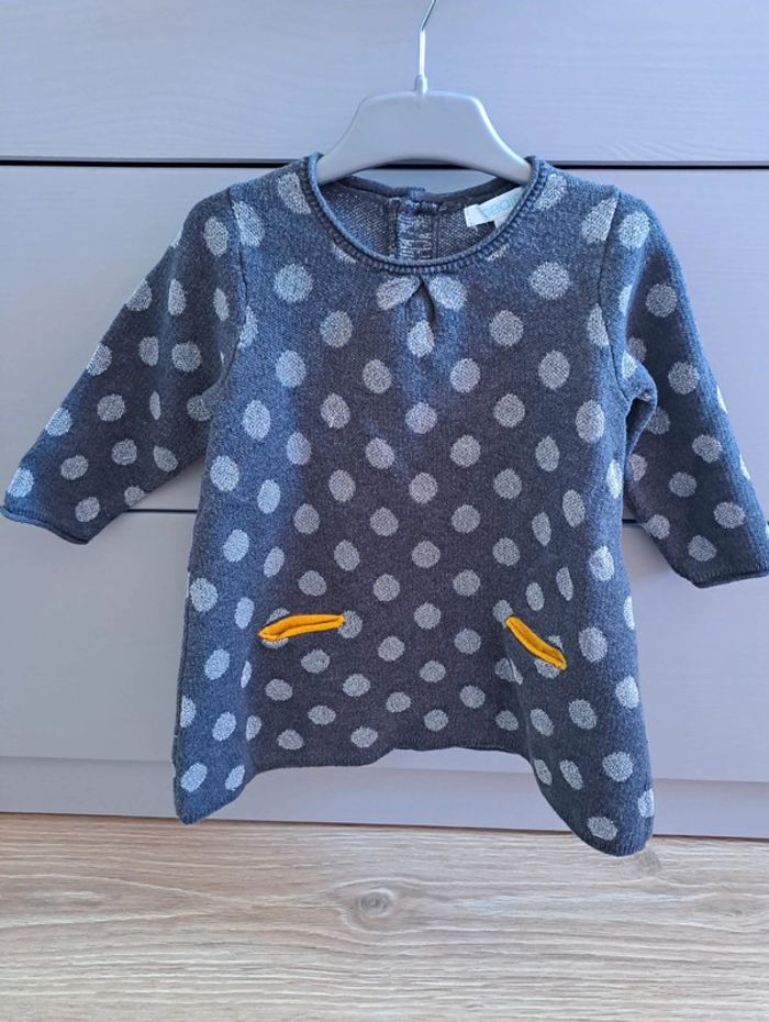 Robe chaude manches longues fermée par 3 boutons derrière Marque Obaïbi Coloris gris foncé avec des pois argentés et des poches moutarde Taille 6 mois (68 cm) 53% coton, 38% polyamide, 6% polyester, 3% fibres métalliques Excellent état #mariliz25fille6mois