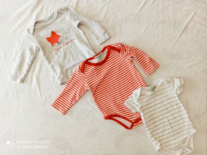Lot 3 bodys dont 2 manches longues et 1 manches courtes. Le orange est un peu plus utilisé (voir photo 2)
