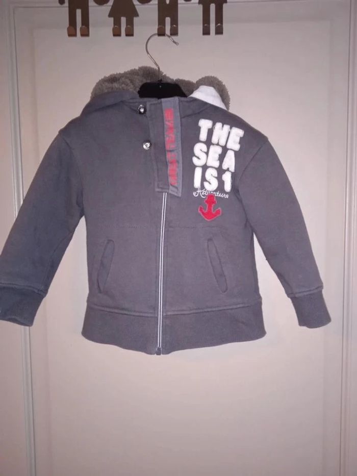 En très bon état, hormis une petite tâche jaune dans le dos sous la Manche droite. Gilet doublé chaud à capuche, se ferme avec une fermeture éclair. #chama_683ans