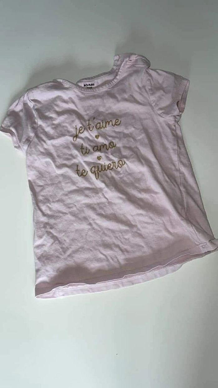 Tee shirt violet très clair avec écrit en doré je t'aime ti amo te quiero très bon état Taille 36mois de chez kiabi #ludie8635_3ansfille