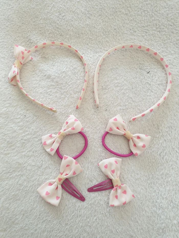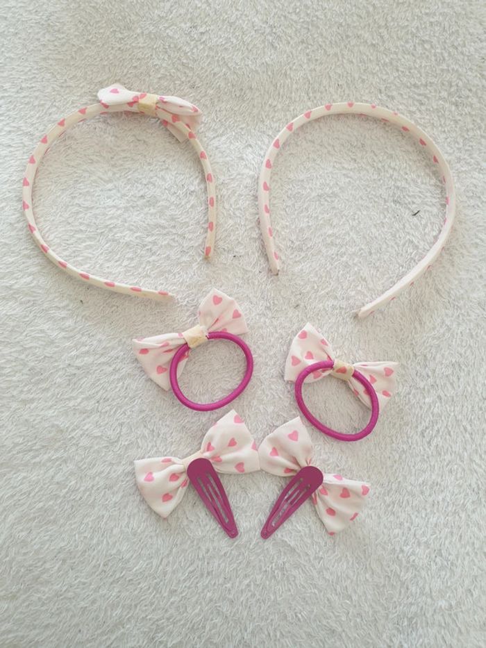 Ensemble d'accessoires cheveux. A coeur rose. 2 serre-têtes, 2 pinces et 2 élastiques. A déjà été utilisé et a quelques traces d'utilisation. #eve.08_accessoire_cheveux