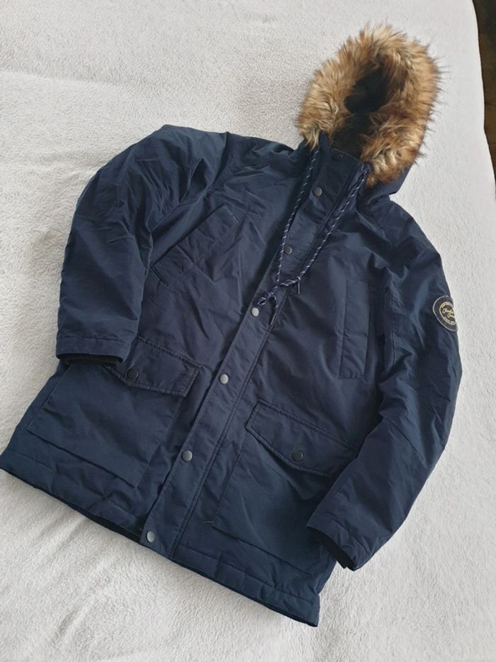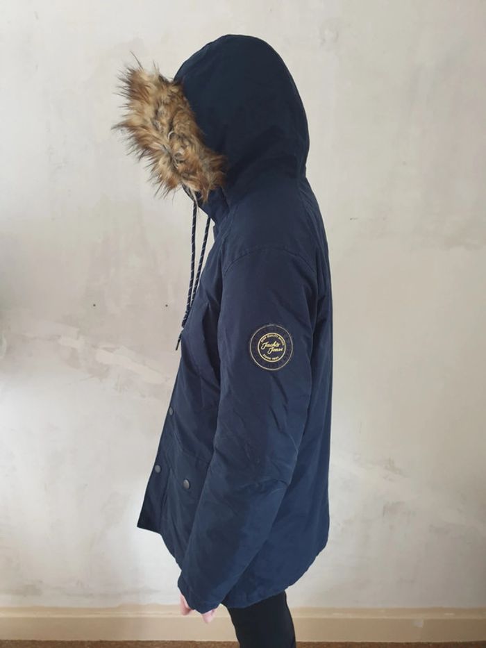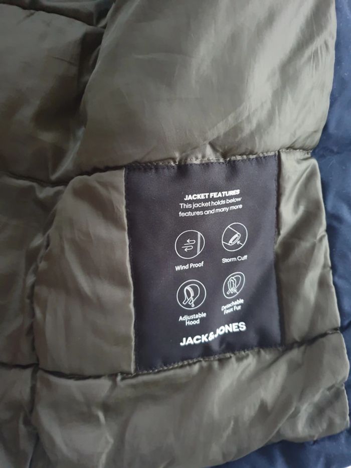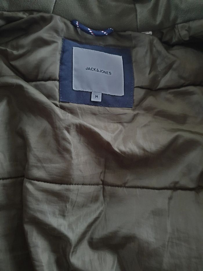 Manteau homme Jack & Jones M. A fermeture éclair et boutons. Capuche. 2 Grandes poches et 2 plus petites au dessus. Photos du manteau porté par ma fille de 1,76m. Très bon état. #eve.08_vetement_homme_M