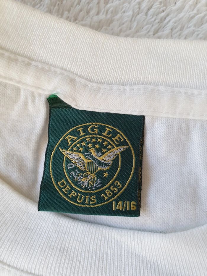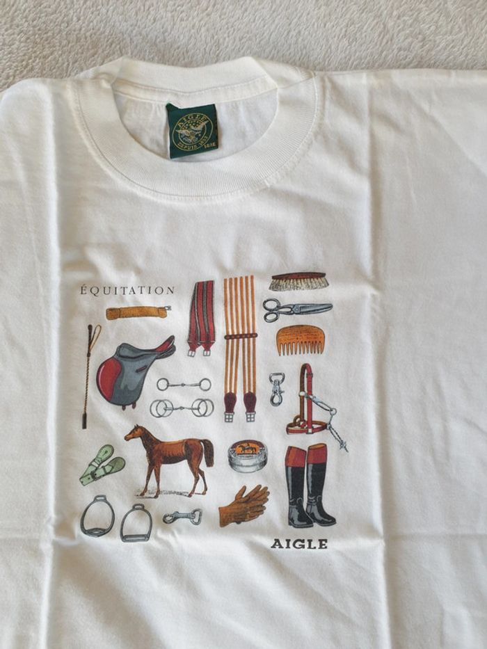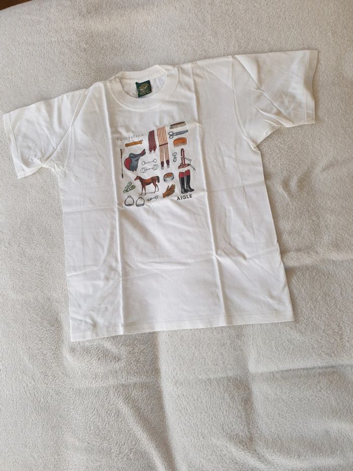 T-shirt 14-16 ans équitation. Blanc crème et dessin dans le thème de l'équitation. T-shirt des année 90 L'Aigle. Parfait état. #eve.08_vetement_fille_14ans #eve.08_vetement_garcon_14ans