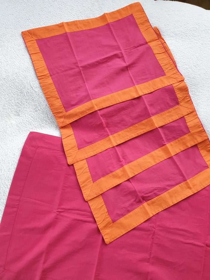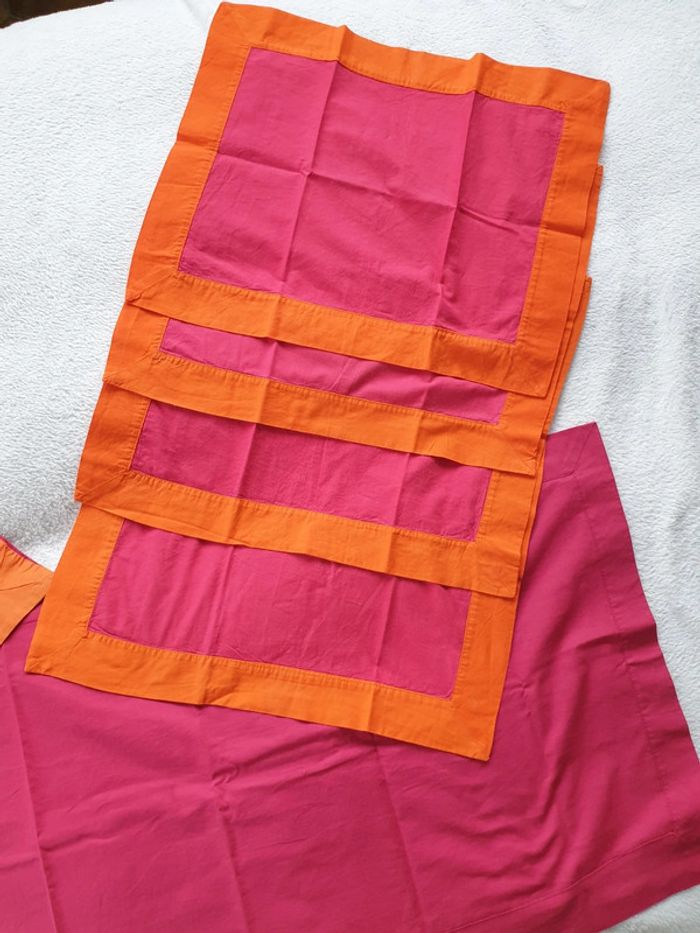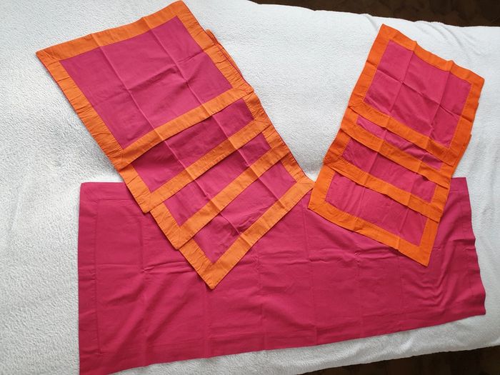 Ensemble comprenant 1 chemin de table et 8 sets de table en coton. Couleur bordeaux et orange. Le chemin de table mesure environ128x48cm. Et les sets de table mesurent environ 48x35cm. #eve.08_deco