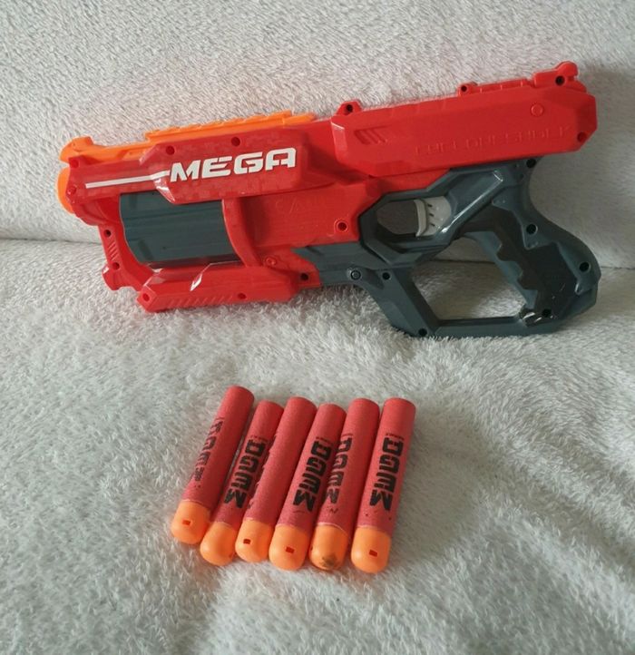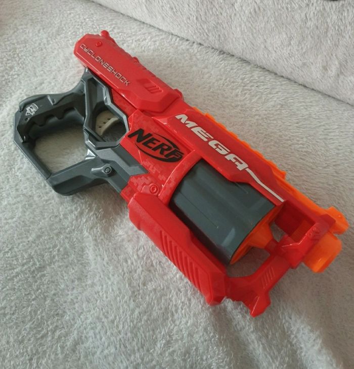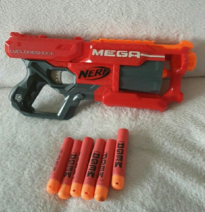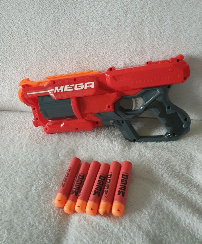 Nerf n-stryke elite mega cycloneshock Mesure 36 cm et peut lancer rapidement 6 gros projectiles l'un après l'autre. Avec ses 6 grosses fléchettes mega. Propre en très bon état.