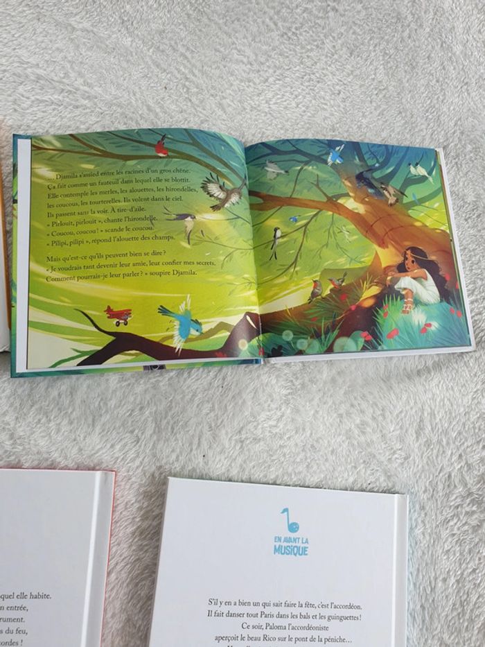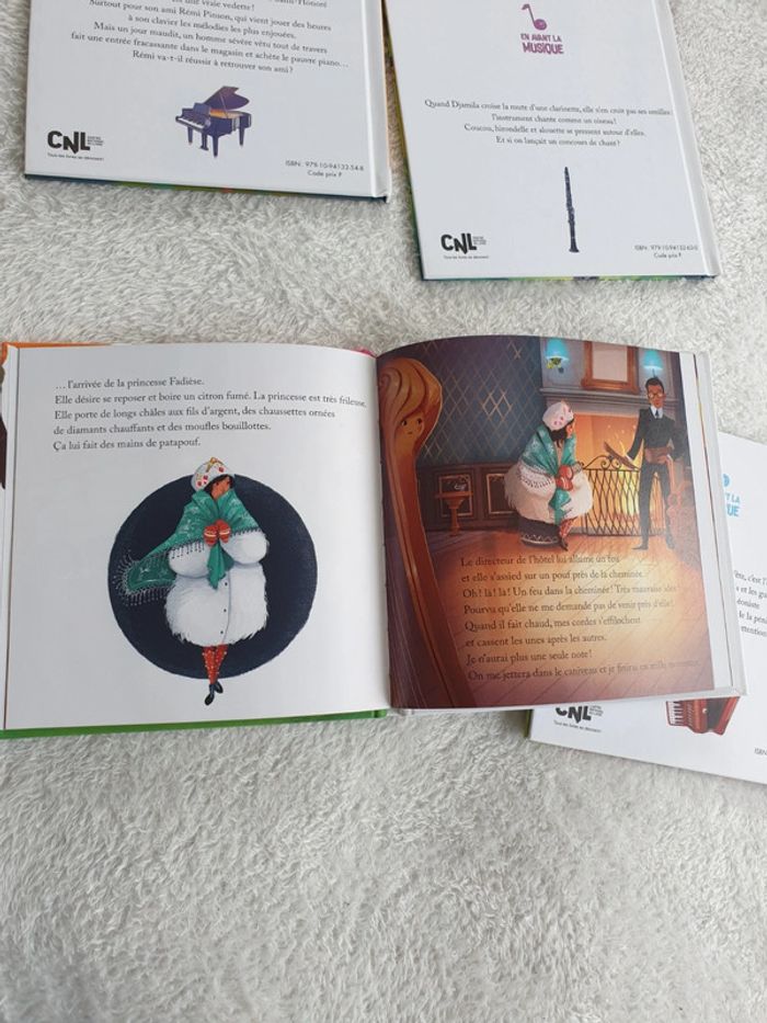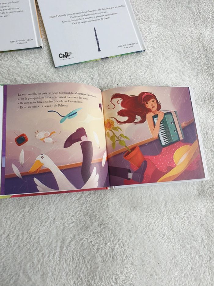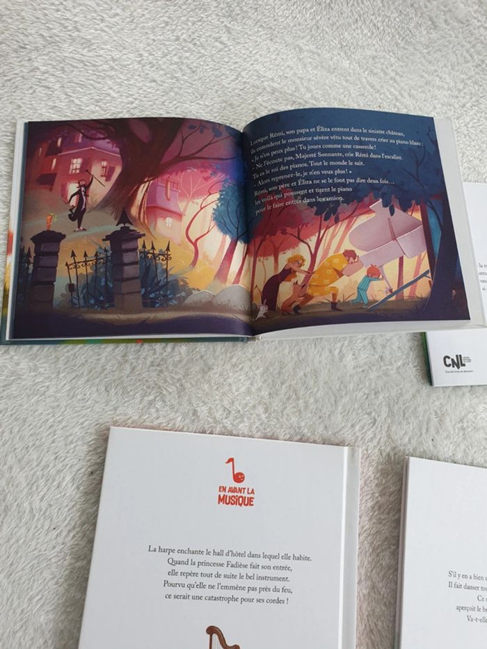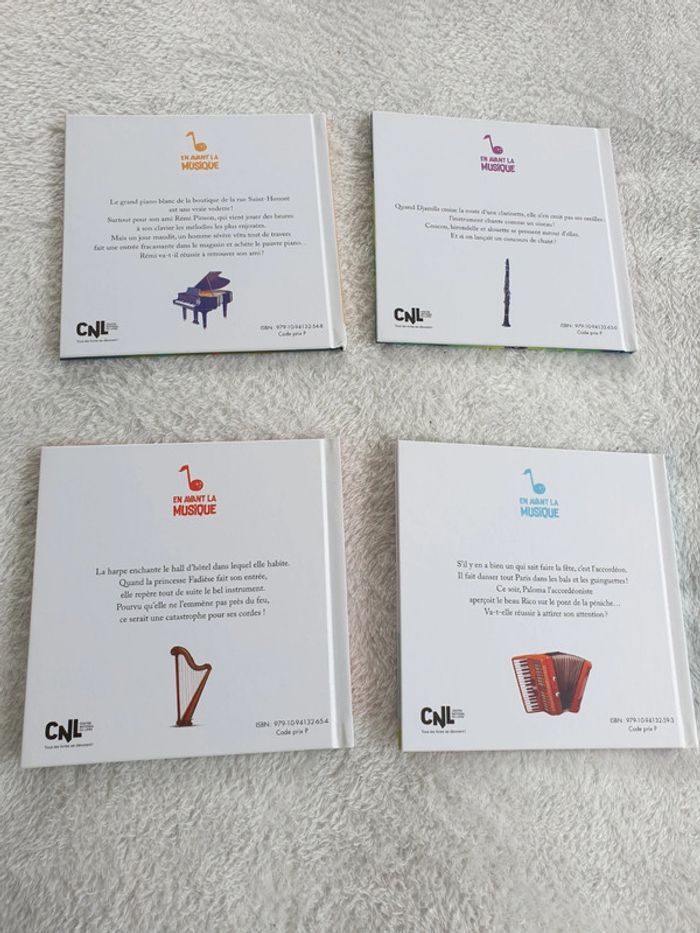 Ensemble de 4 livres collection En avant la musique: Le piano blanc La Clarinette qui parlait aux oiseaux L'accordéon marchand de bonheur Concerto pour Harpe chat et poney Parfait état. #eve.08_livre