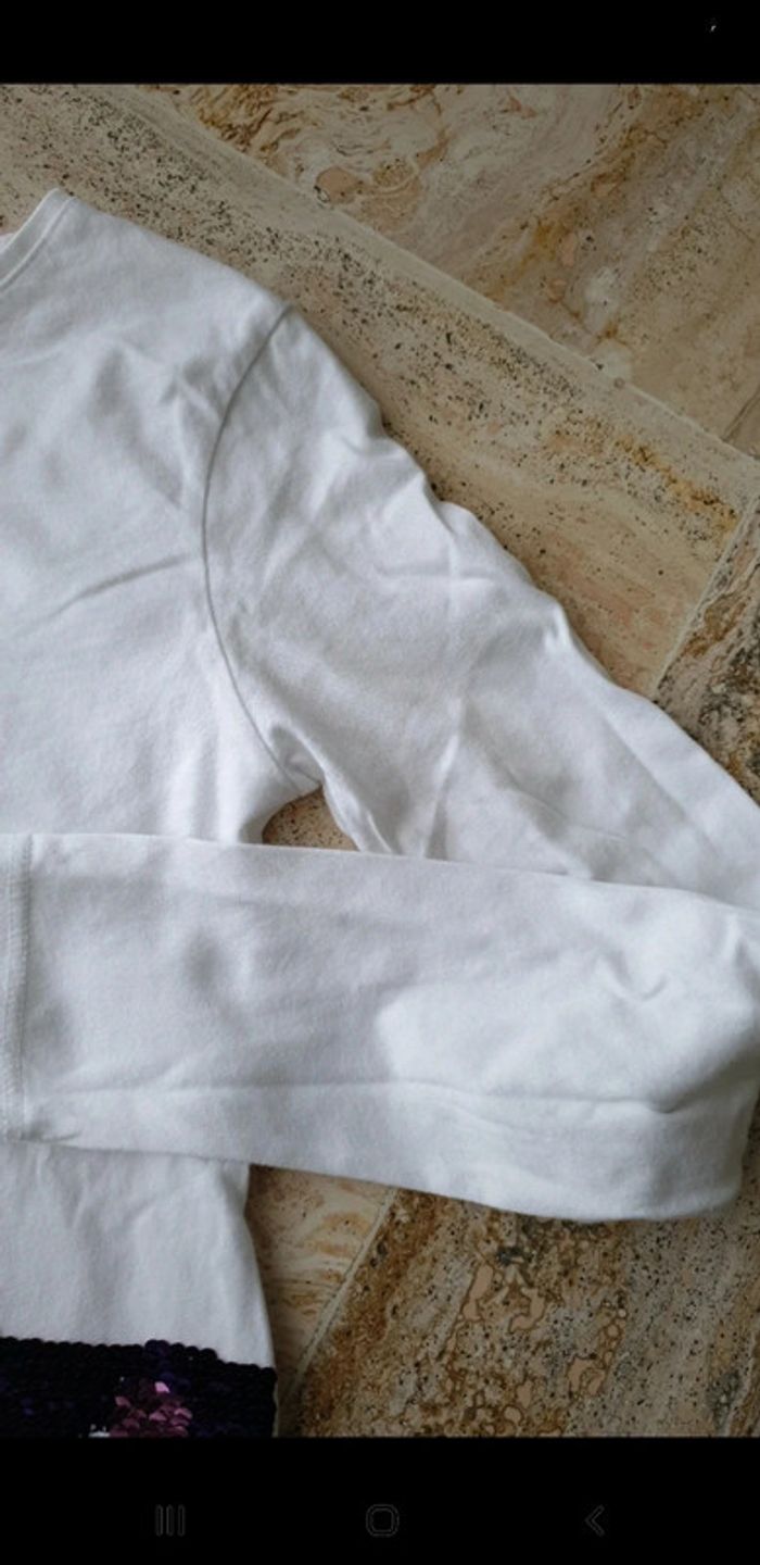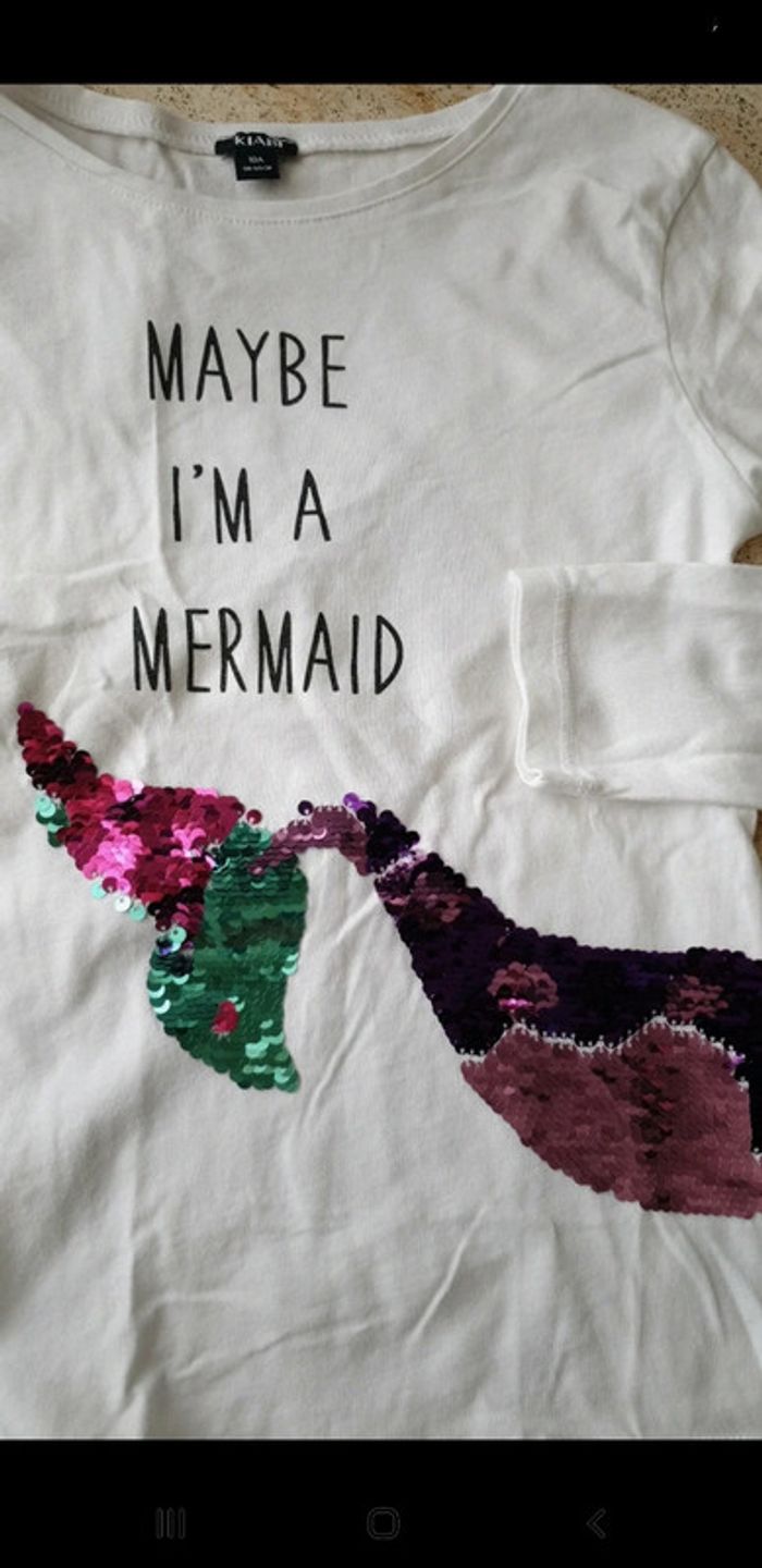 T-shirt 10 ans. Blanc. Manches longues. Queue de sirène en sequins. Parfait état. Porte 1 ou 2 fois. #eve.08_vetement_fille_10ans