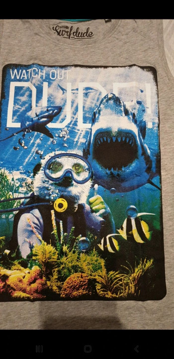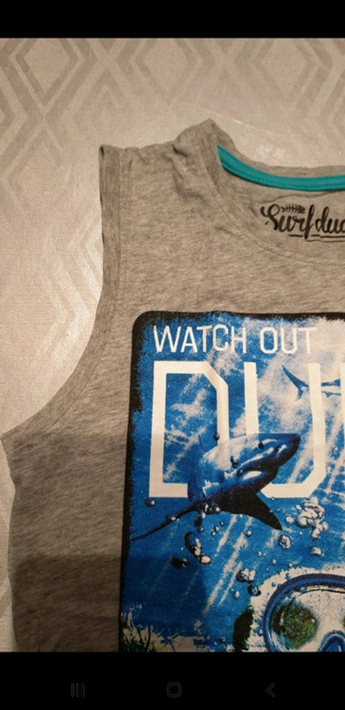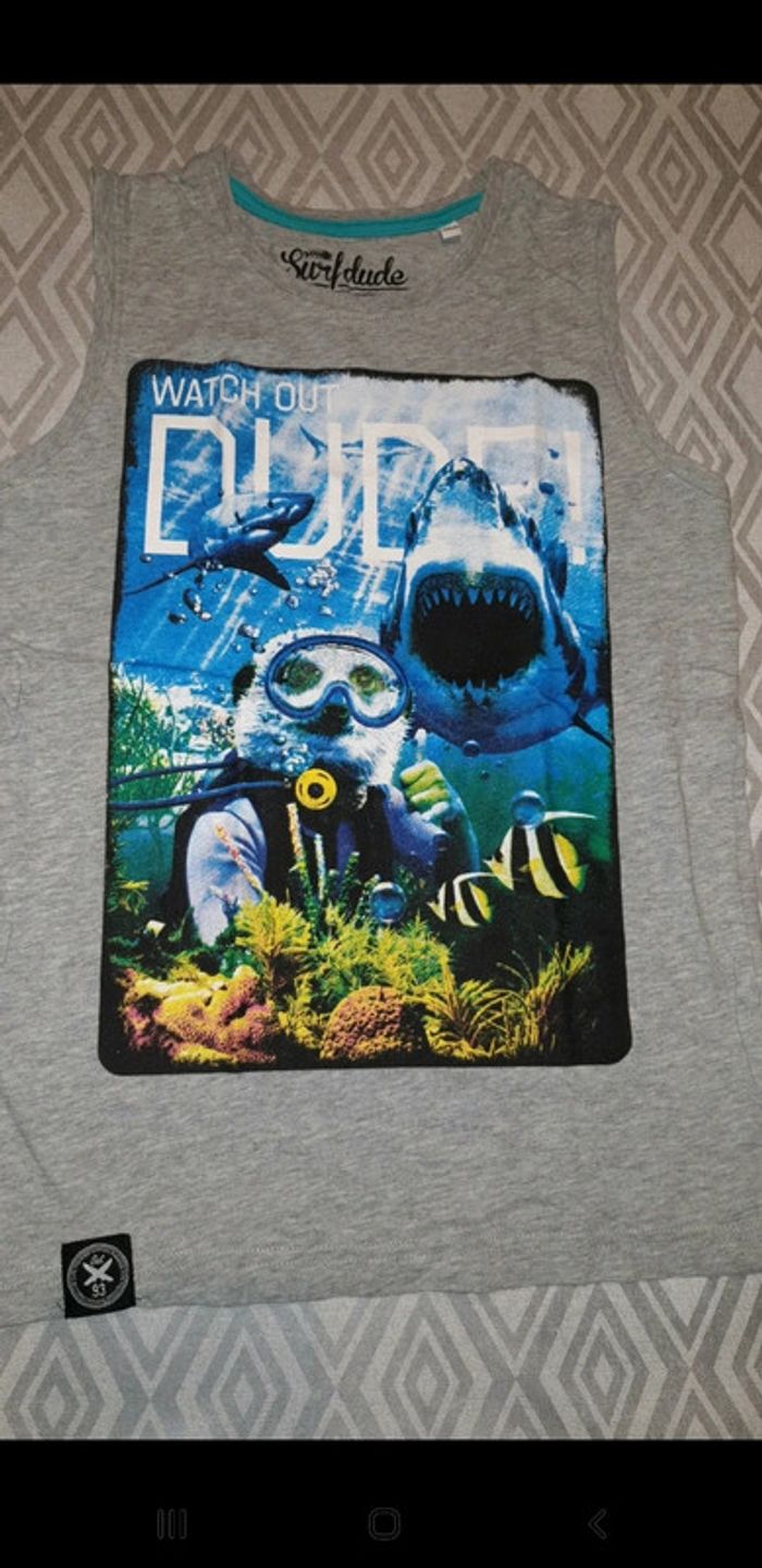 T-shirt sans manche gris. Taille 10 ans. Débardeur ou Marcel. Tres bon état. Dessin requin. #eve.08_vetement_garcon_10ans