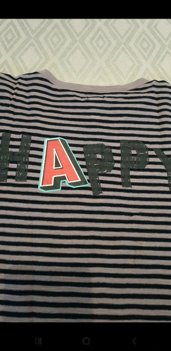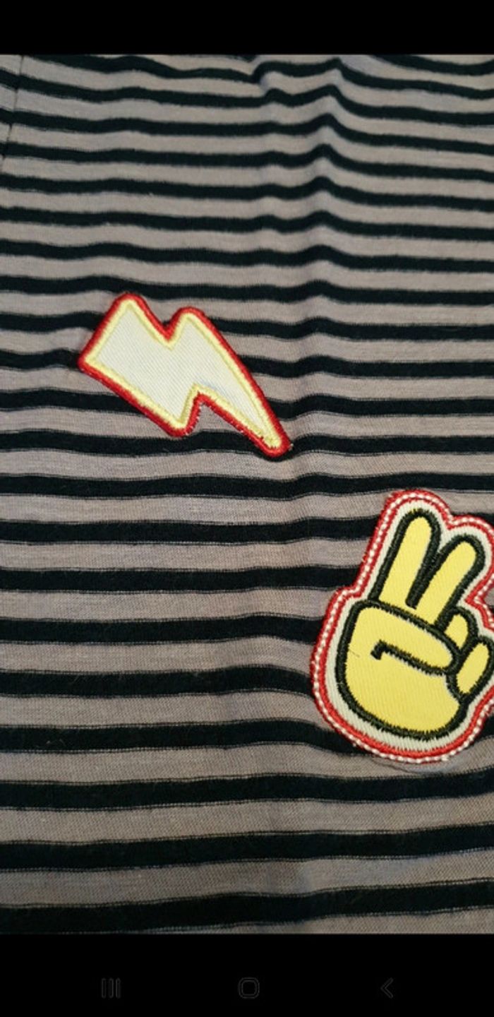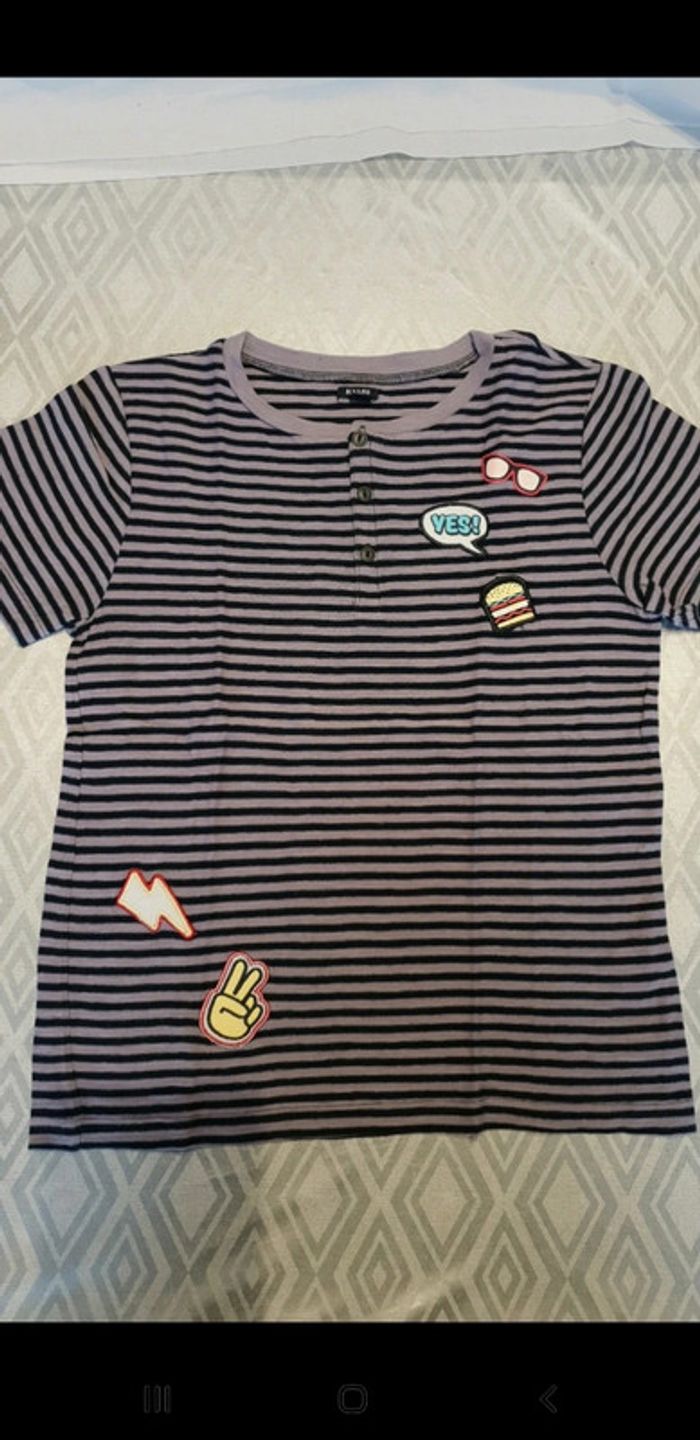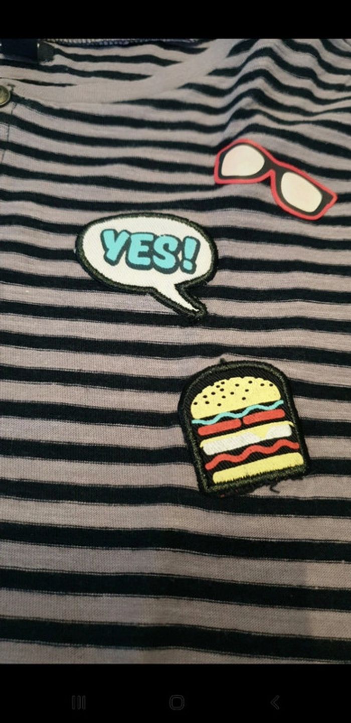 T-shirt manches courte a lignes bleu marine et violettes. Taille 12 ans. Très bon état. Boutons devant. Stikers humoristiques. #eve.08_vetement_garcon_12ans