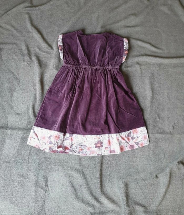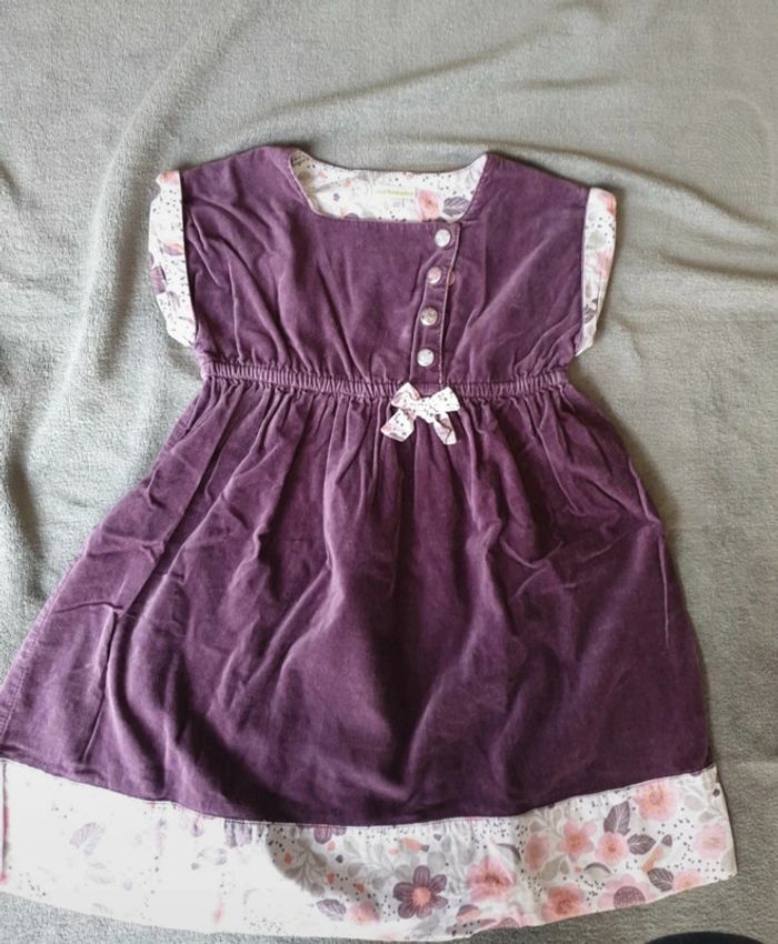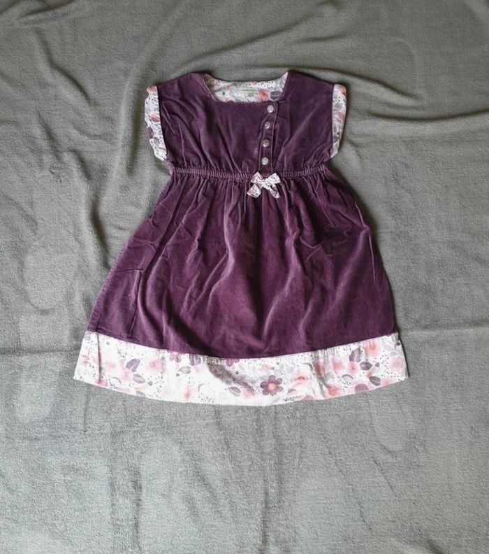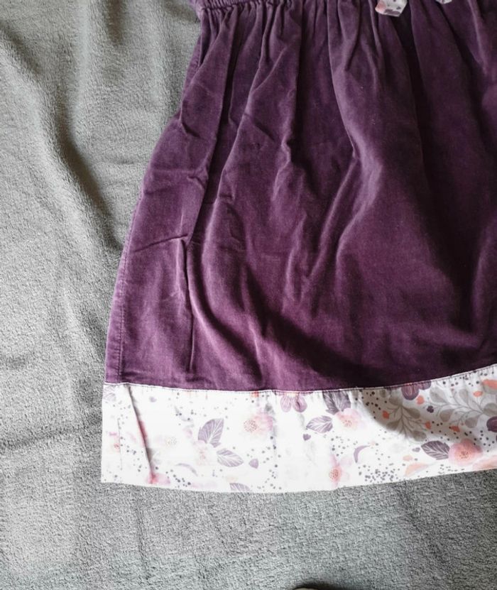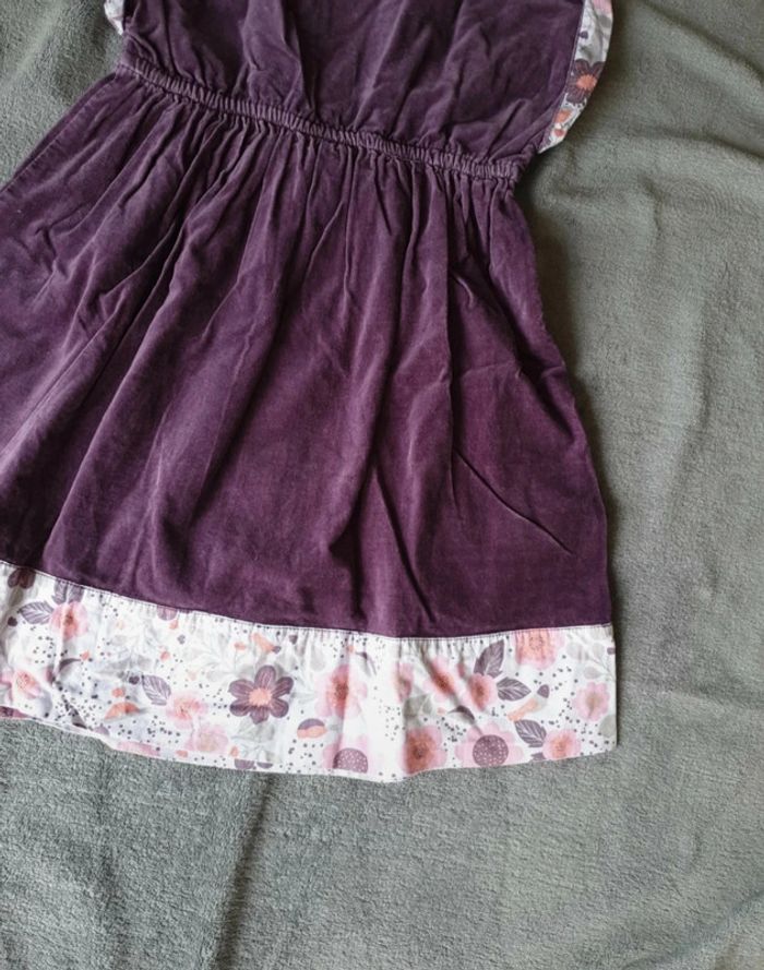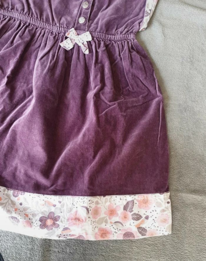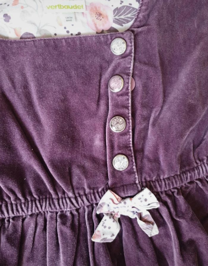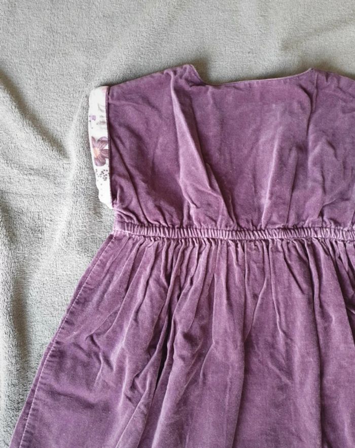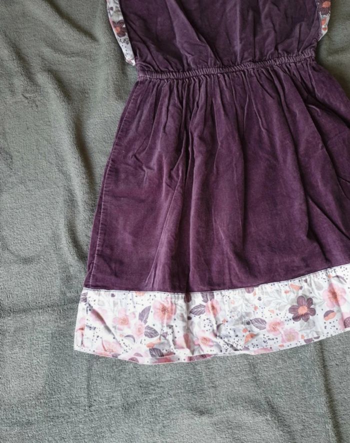 Robe 8 ans. Effet Velours. Violette avec une doublure blanche a fleurs et poids. Boutons sur le devant. Cintrée à la taille avec un élastique. #eve.08_vetement_fille_8ans