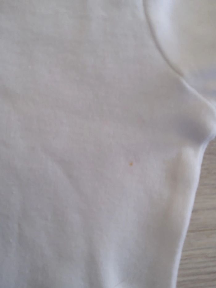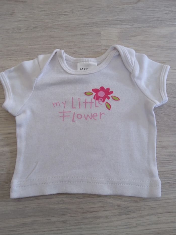 T-shirt blanc petite fleur, 1 mois. Petites traces voir dernière photo. #eve.08_vetements_fille_1mois
