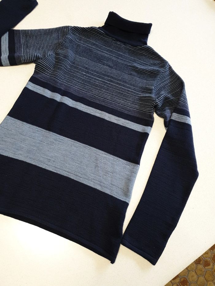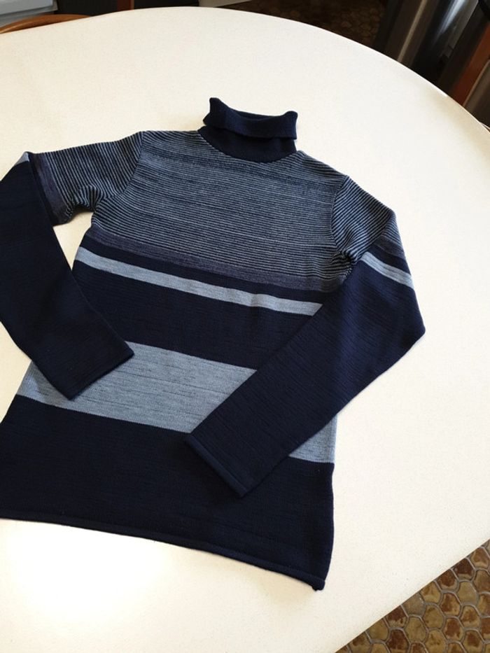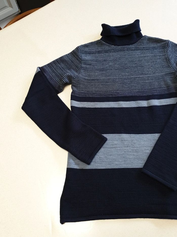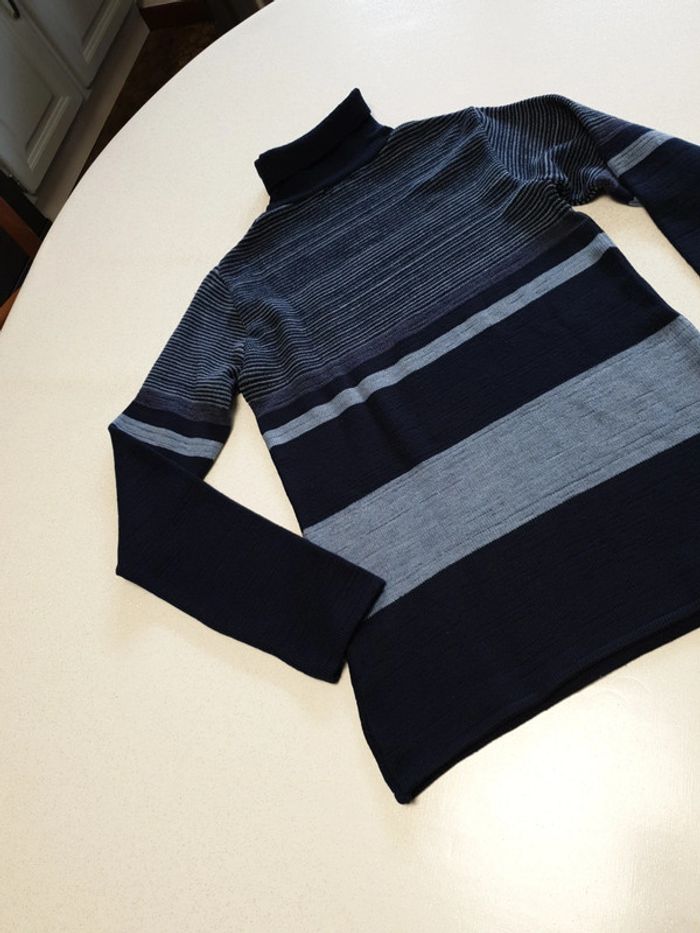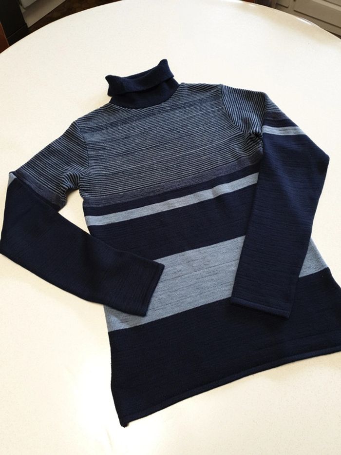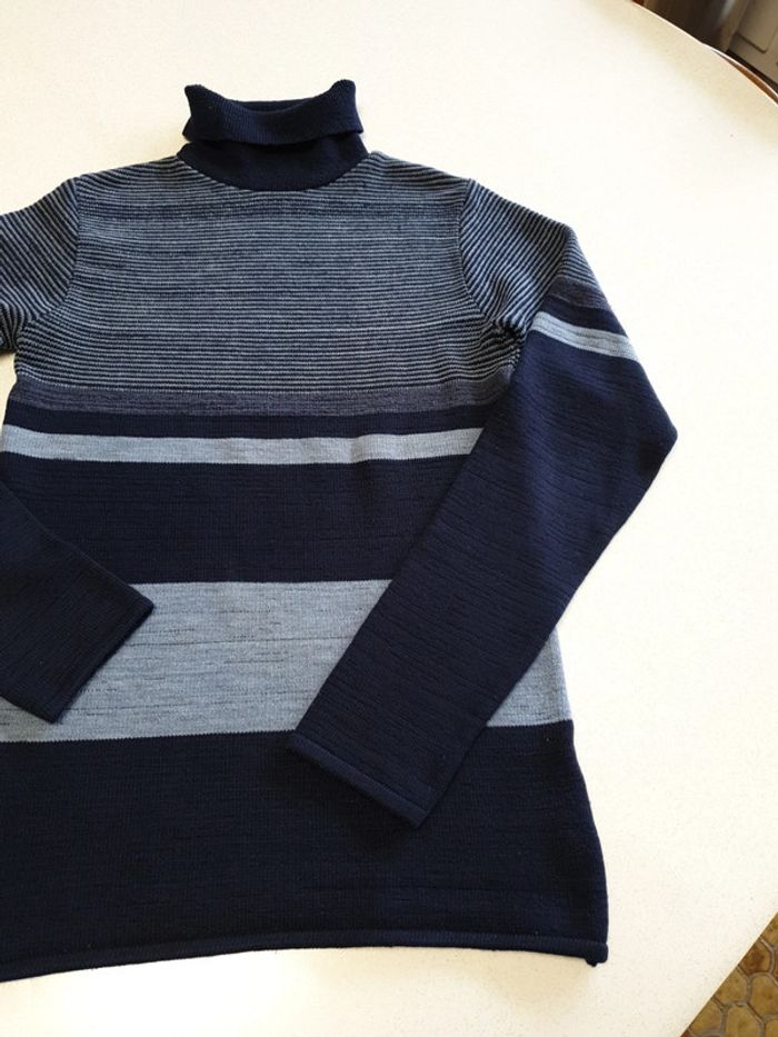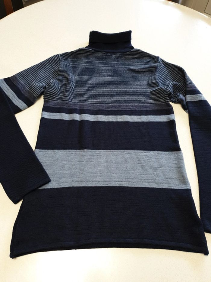 Pull femme. Taille 2, M. Variances de bleus. Elastique donc agréable à porter. Col roulé. Pull long. #eve.08_vetement_femme