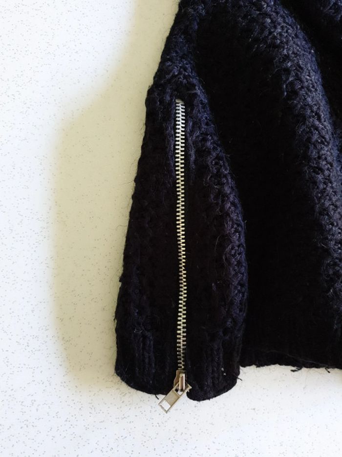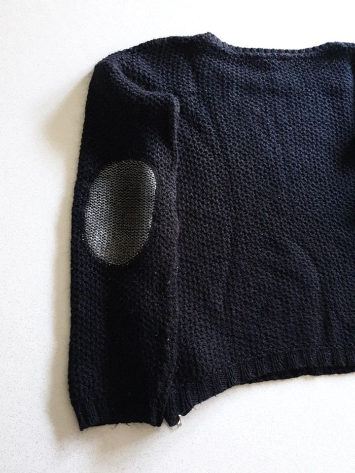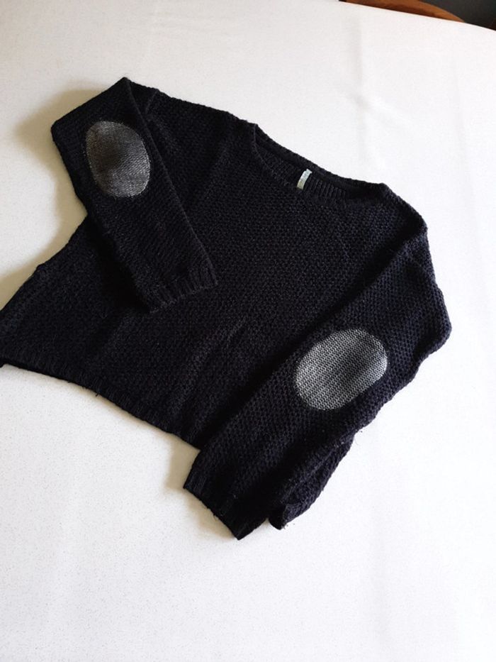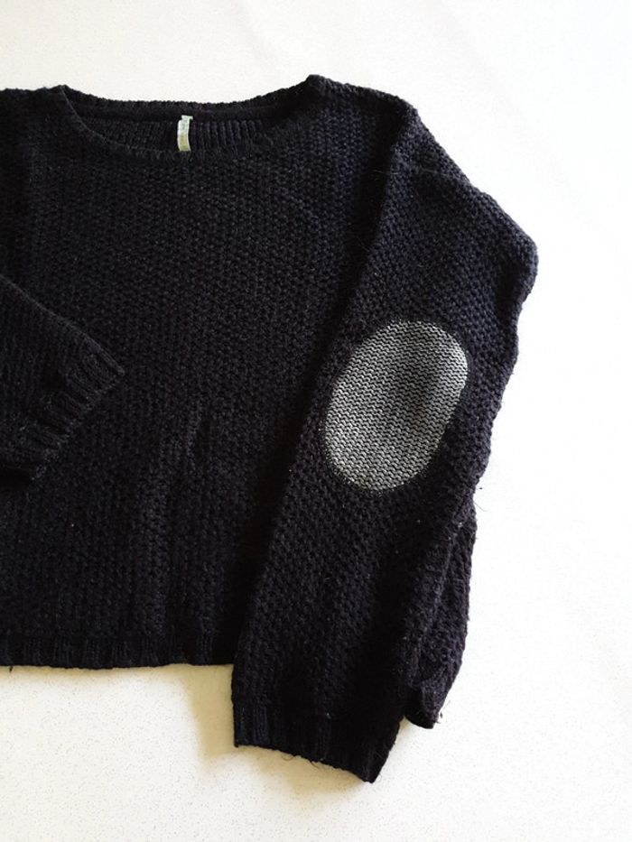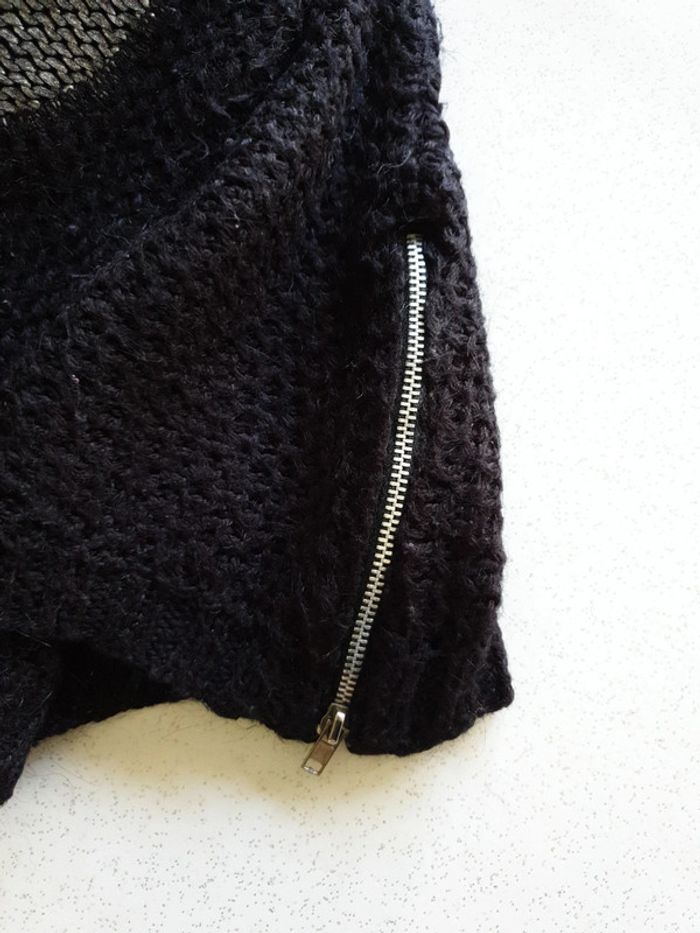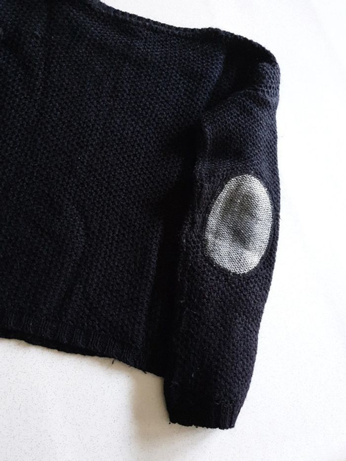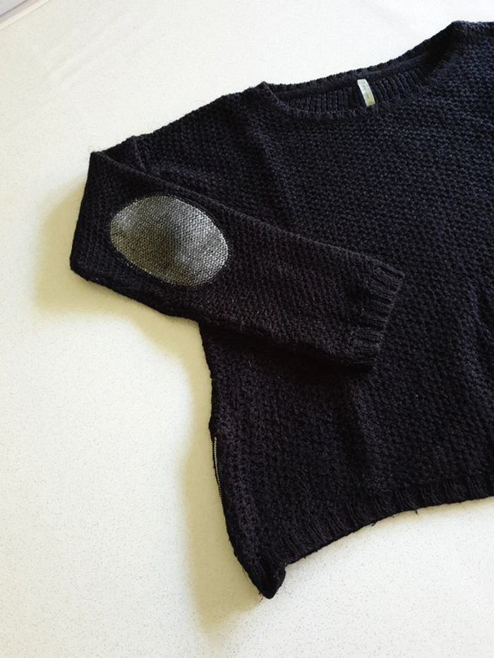 Pull noir femme M. Fermeture éclairs sur les côtés. Grosses mailles. Coudes argentés. #eve.08_vetement_femme