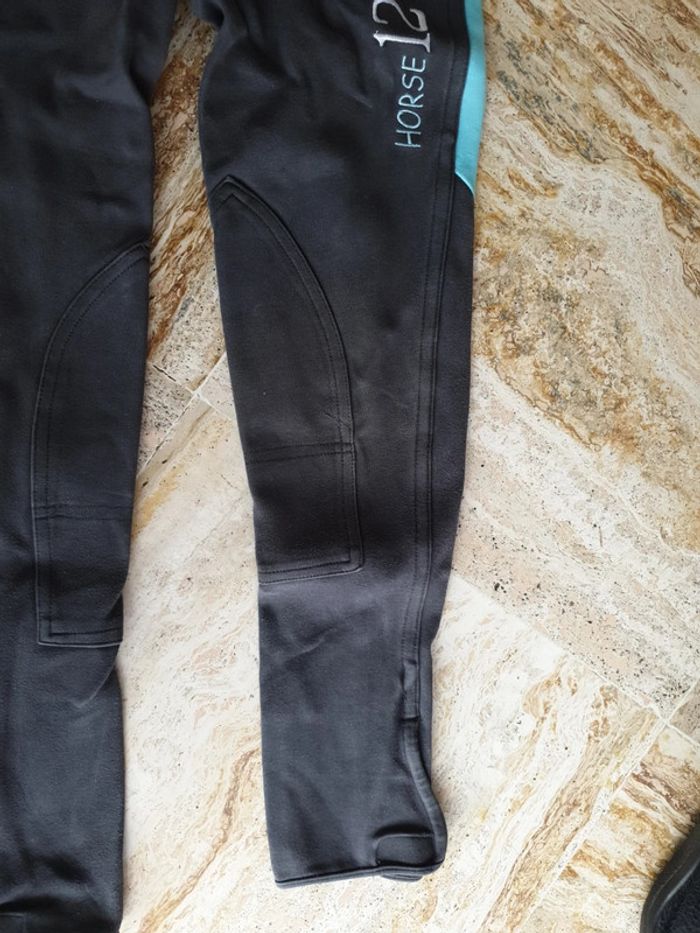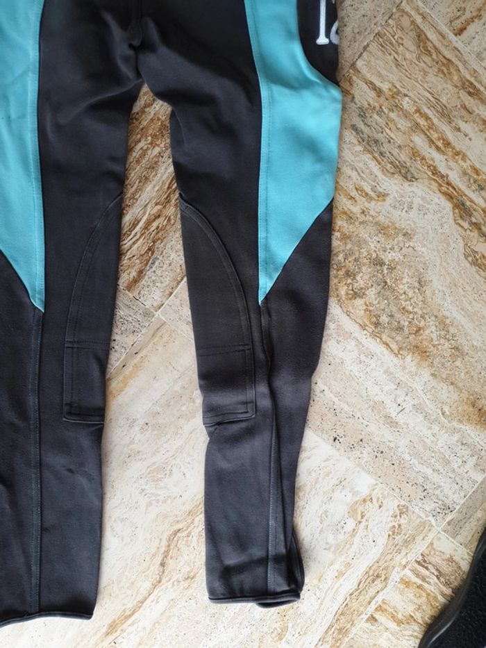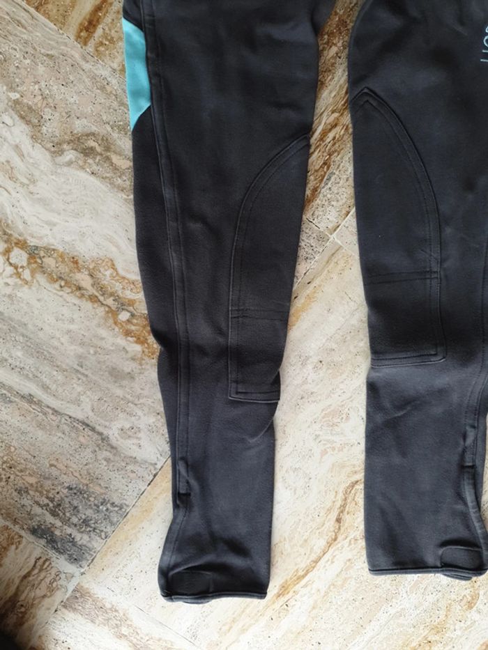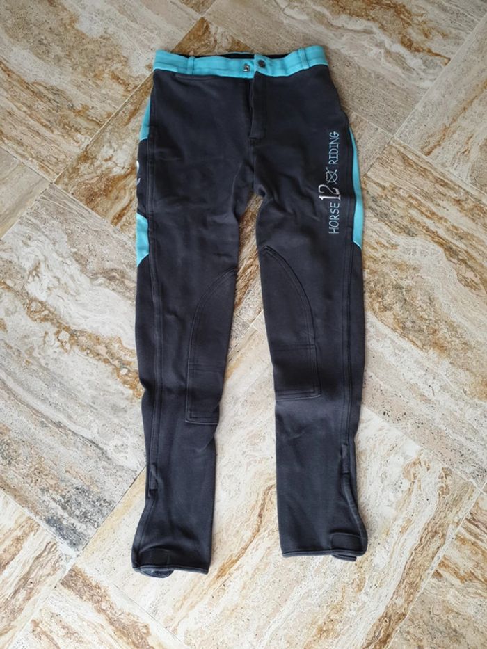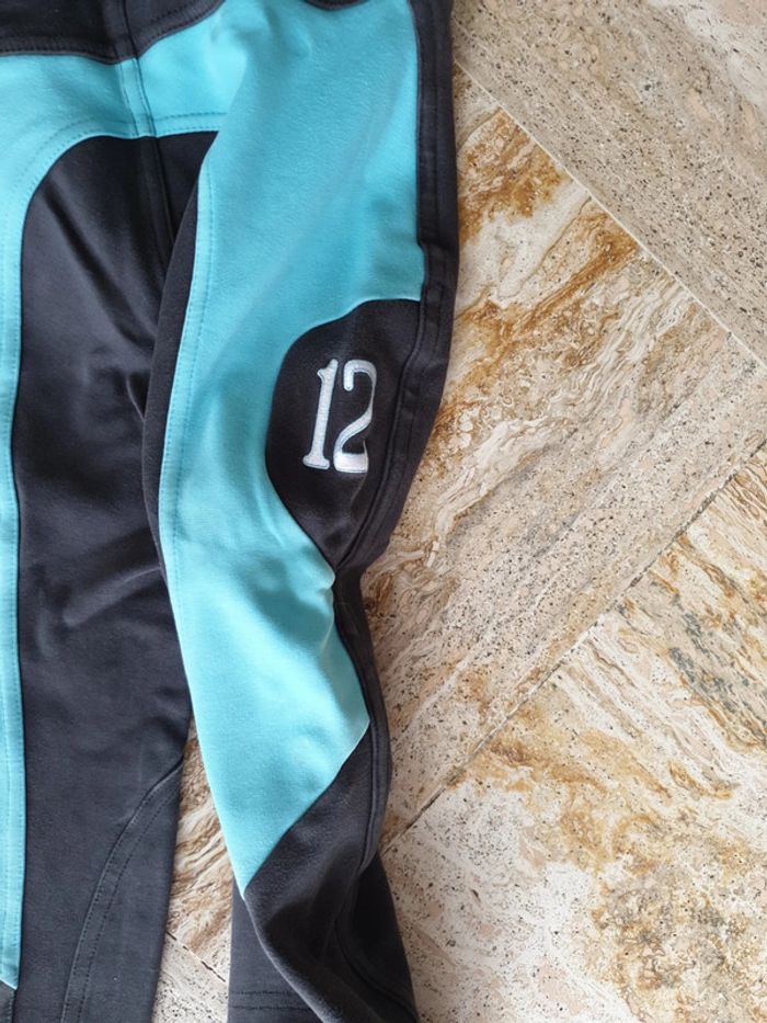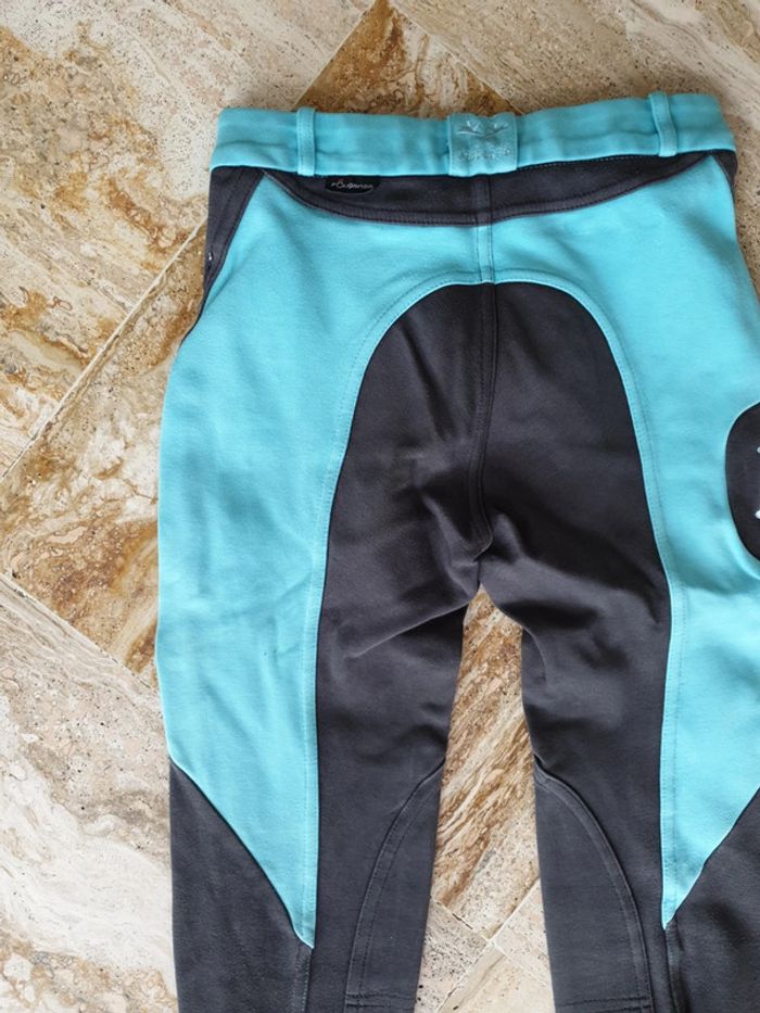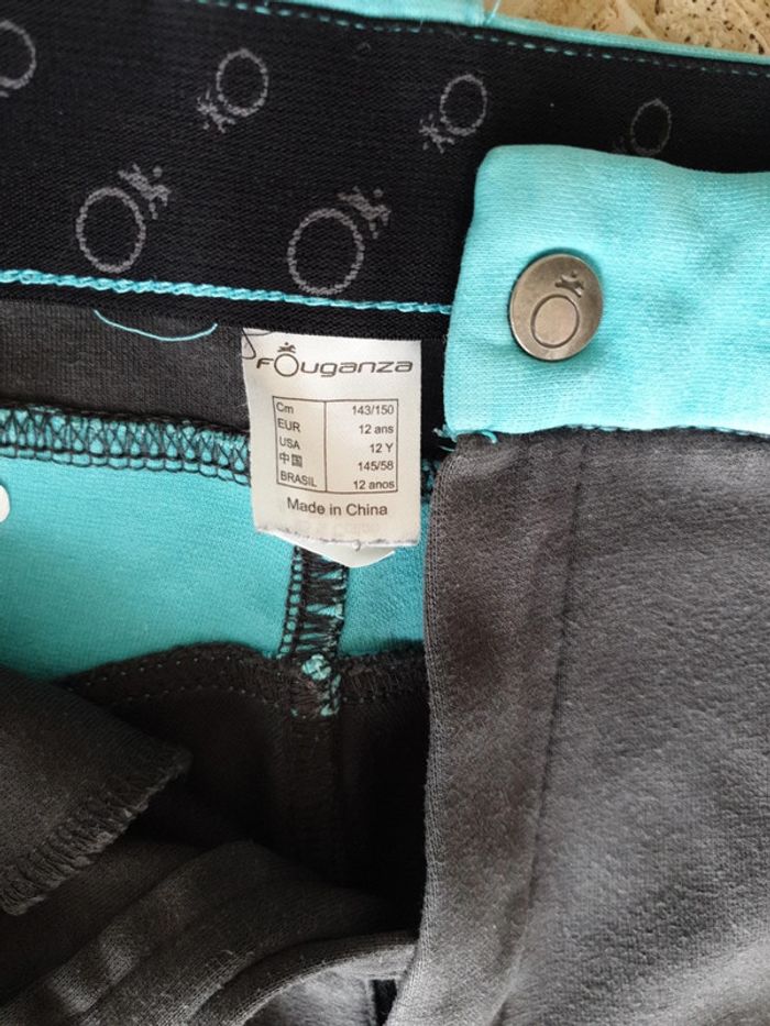 Pantalon équitation 12 ans. Gris et turquoise. Avec une poche et des velcros aux chevilles. #eve.08_vetement_fille_12ans
