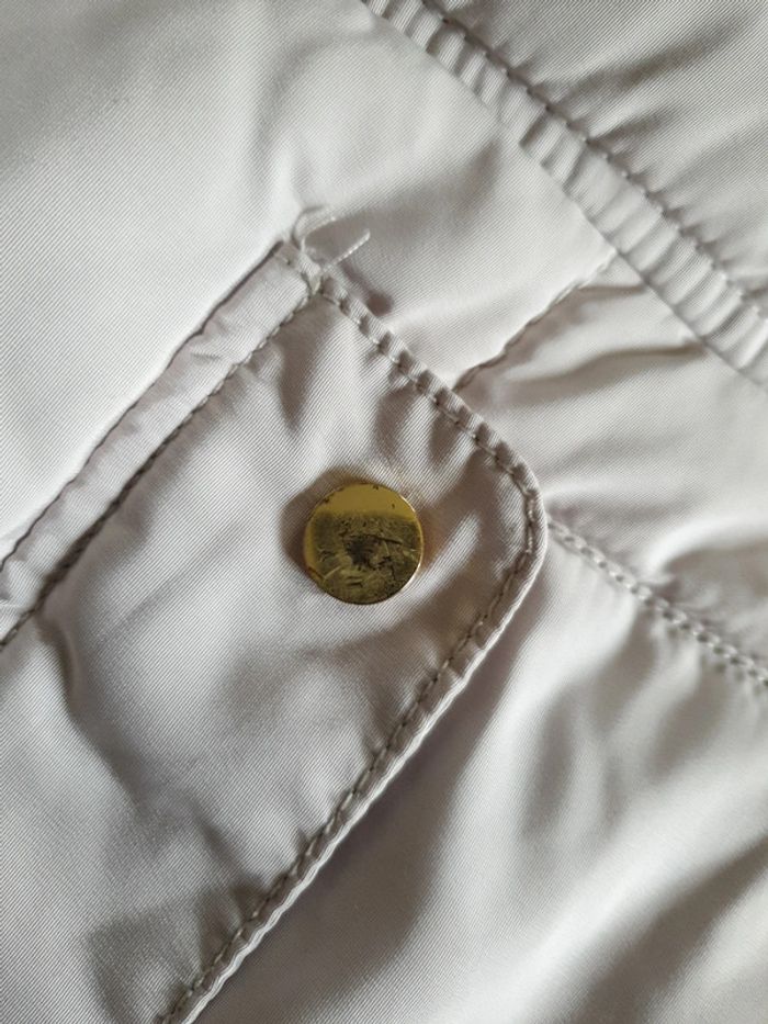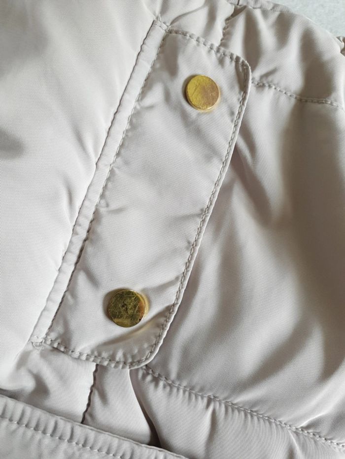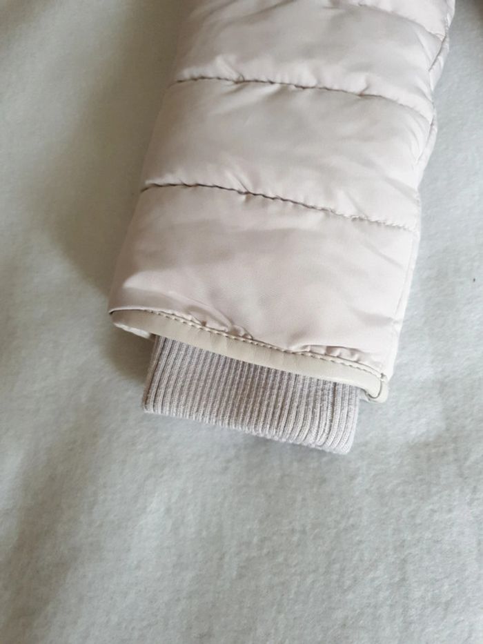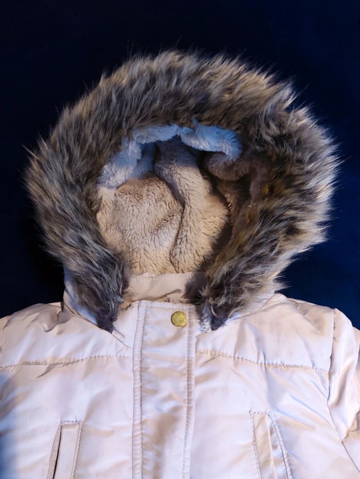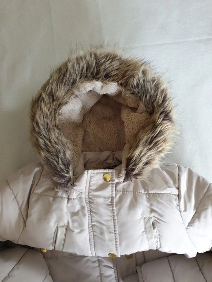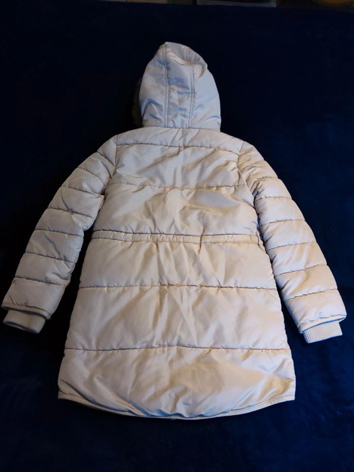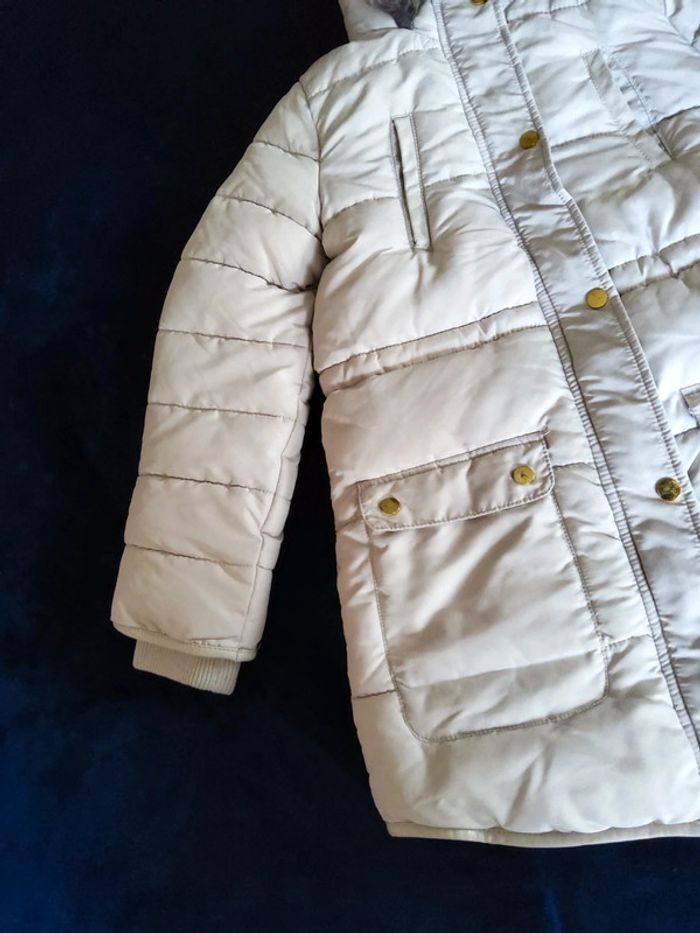 Manteau, doudoune 12 ans. Couleur crème, blanc cassé. Grande poches. Capuche. Tres chaud et epais. Petites traces d'usure sur les cache boutons (voir photo).