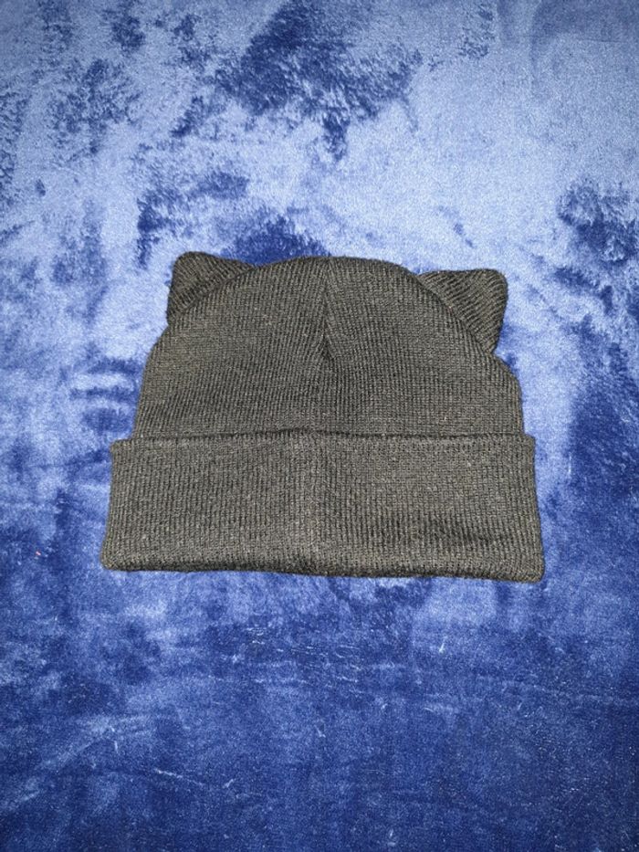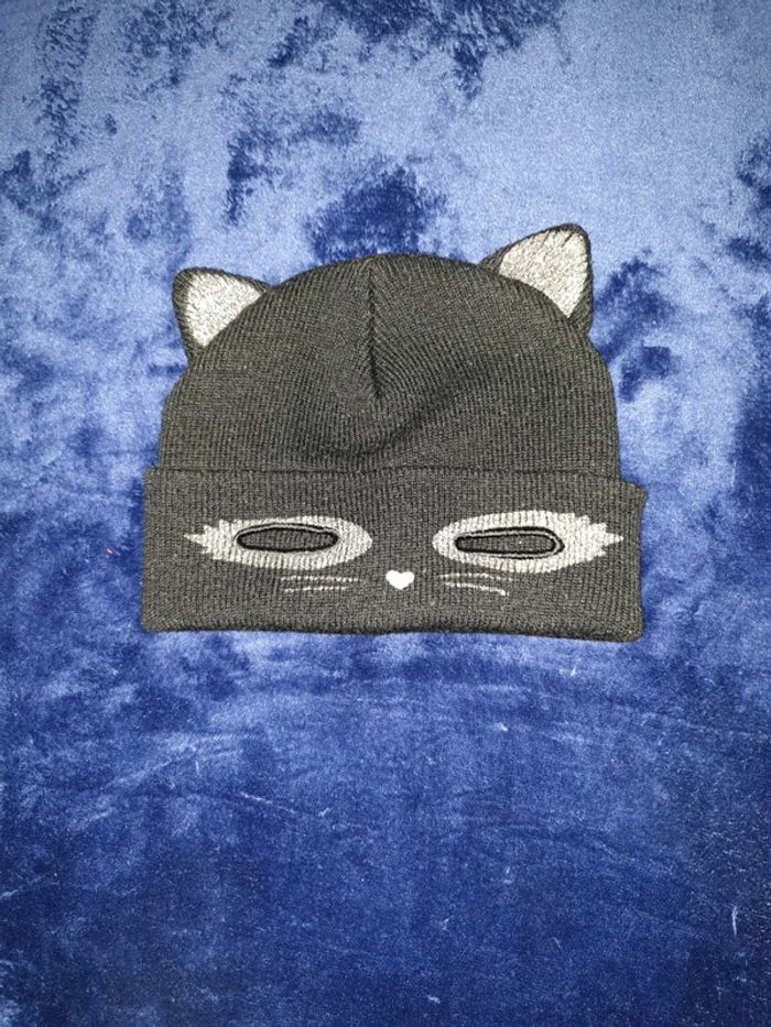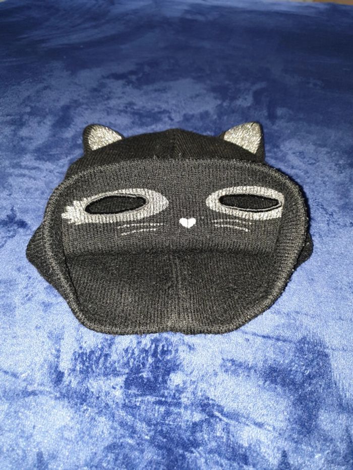 Bonnet noir et argenté. Avec des yeux, des moustaches, un nez de chat et des oreilles. #eve.08_bonnet