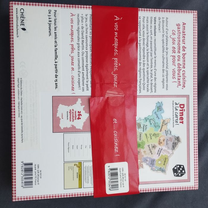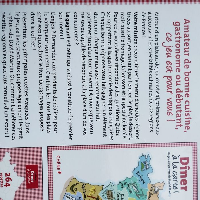 Dîner à la carte - Un jeu et un livre, Jouez et cuisinez de David Martin. Questions et Réponses Jeu de plateau. A partir de 15ans de 2 à 8 joueurs. Neuf dans son coffret jamais utilisé ! Prix d'achat 30€.
