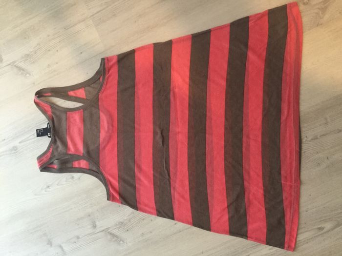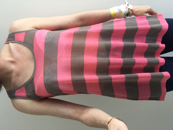 Débardeur long, rayé rose et gris, de chez h&m, fin donc un peu transparent, taille S. Idéal comme tunique de plage par dessus le maillot de bain.