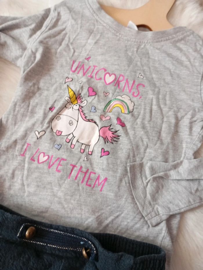 Petite tenue apporter ensemble ou séparément comprenant un t-shirt manches longues gris avec un imprimé licorne illumination présents minions Et un bas molletonné façon jogging chic ikks petite usure au niveau des genoux montre en photo #ikks #minions #izianatroisans