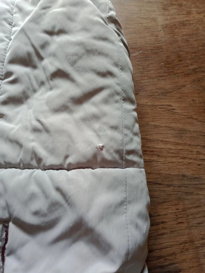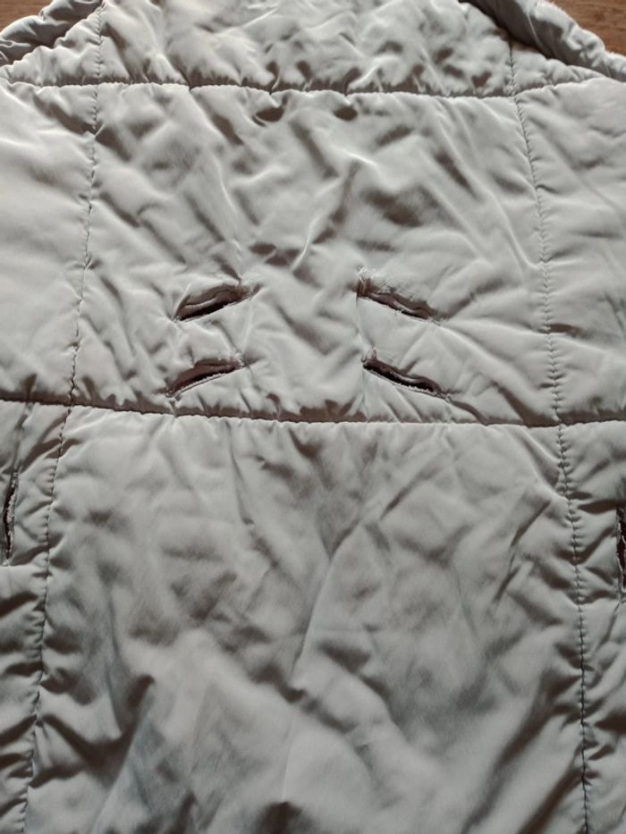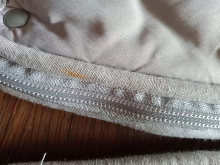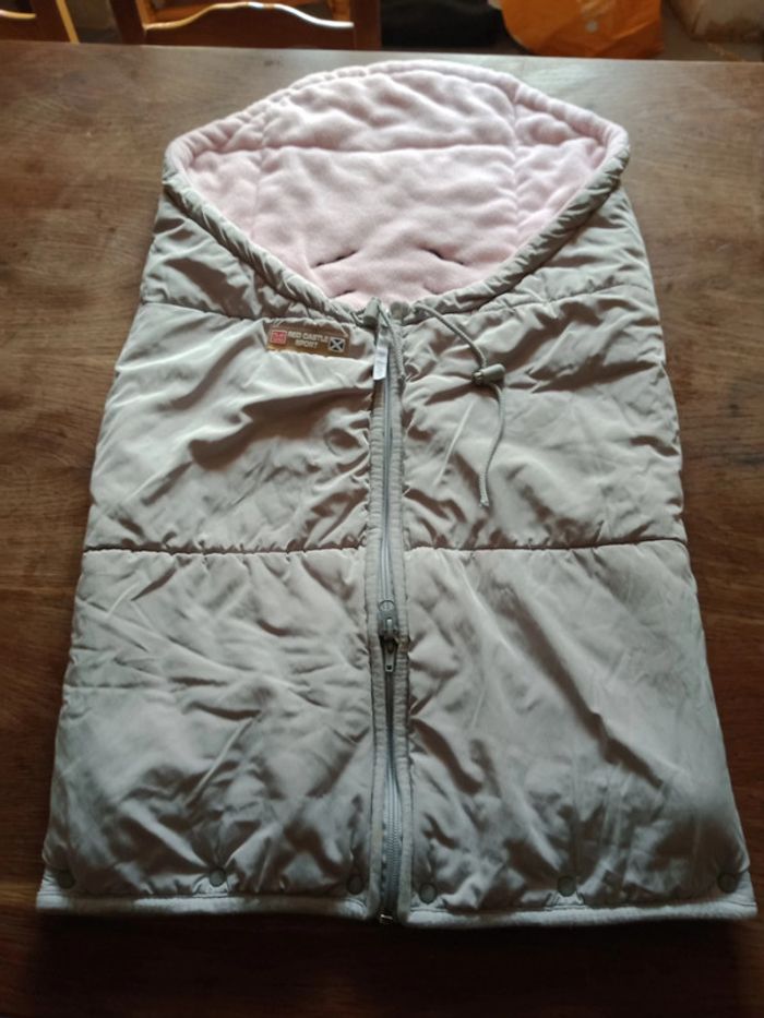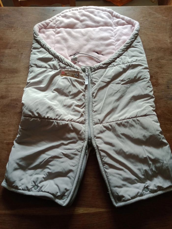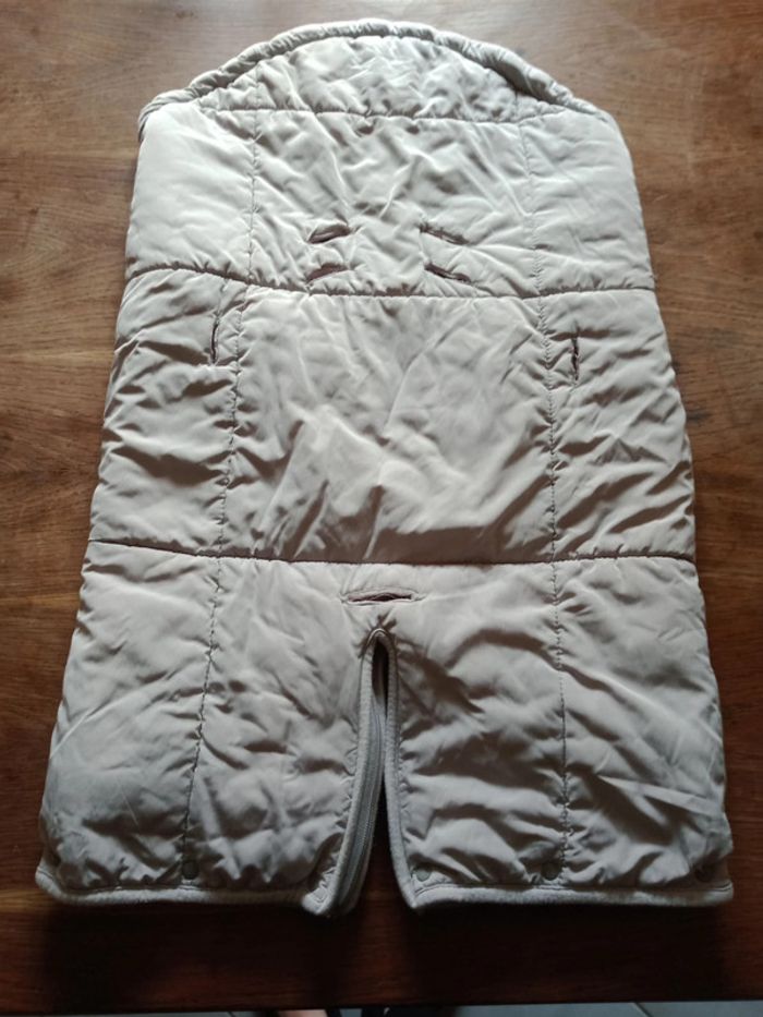 Chancelière pour cosi ou poussette.....on peut la mettre en intégrale ou en version jambes séparées pour les plus grands...cordon de serrage pour bien couvrir la tête Il y a un petit accro sur le côté et une petite tâche, ce qui n empêche en rien son utilisation ( voir photo 3 et 4)