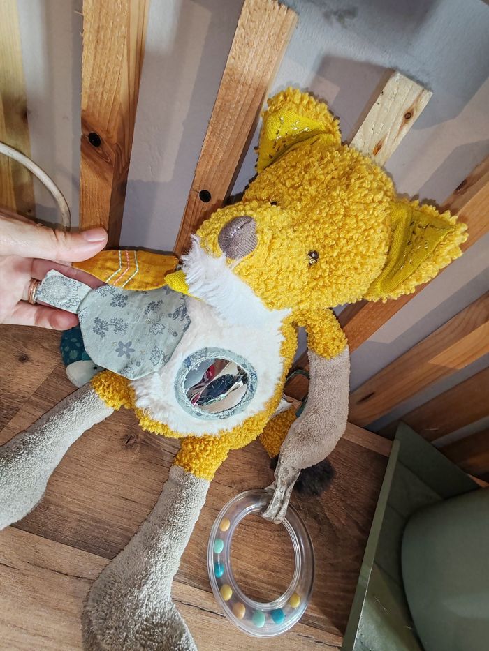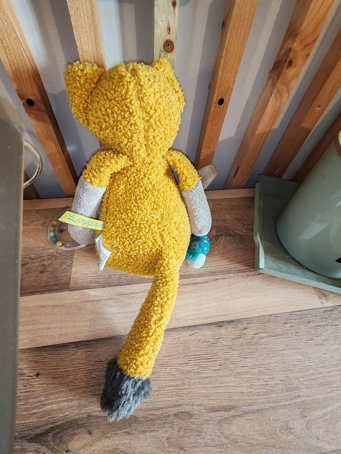 Renard d'activités au doux pelage de fourrure bouclette moutarde et autres matières amusantes, chargé d'accessoires pour divertir bébé : pouet-pouet dans le bout de sa queue, hochet, miroir, plastique qui fait du bruit et anneau à billes. Tbe Environ 35 cm 28 euros Envoi en relais