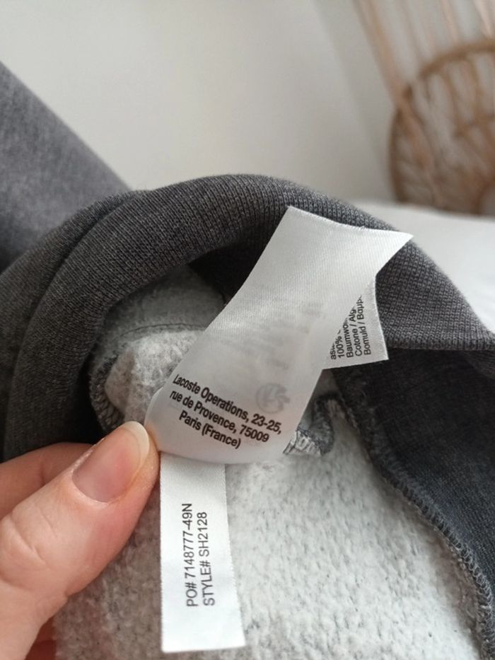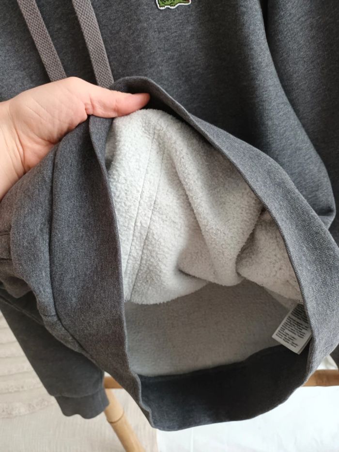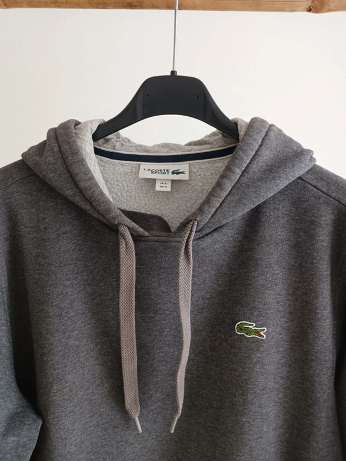 Sweat à capuche hoodie Marque : Lacoste Coloris : gris Taille FR 4 / US M Avec deux poches Intérieur molletonné / polaire Très peu porté, il est en très bon état (le seul défaut un tout petit accro visible en photo)