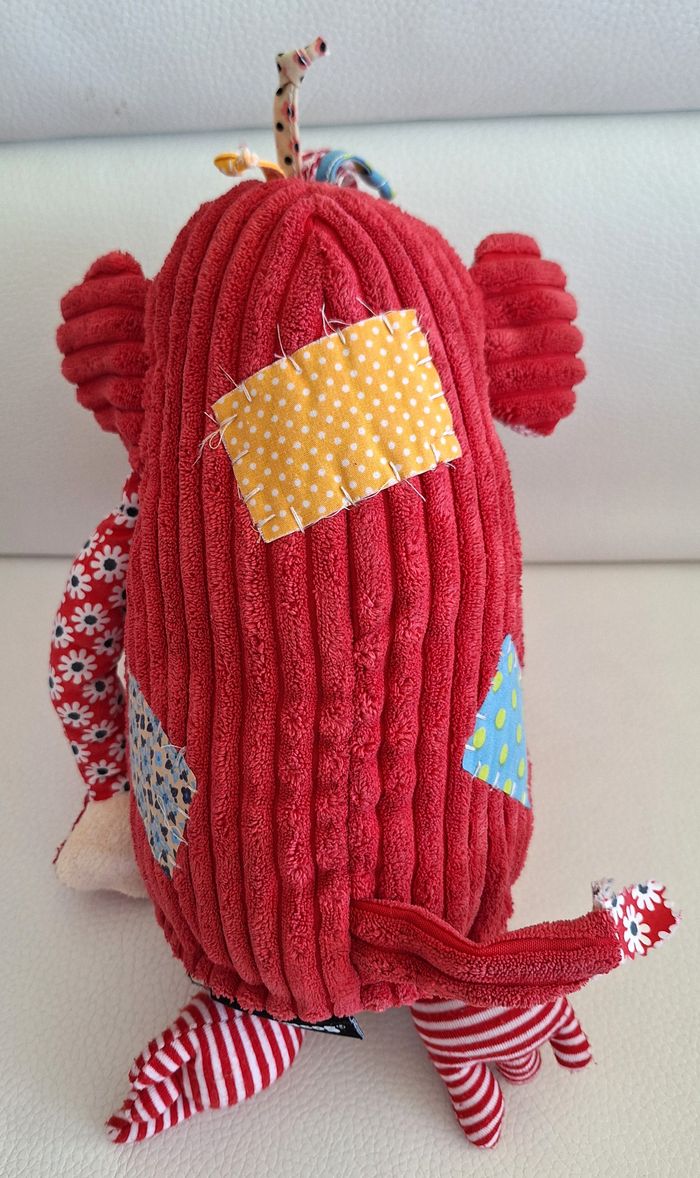 PELUCHE SINGE BOGOS DES DEGLINGOS QUI MESURE ENVIRON 34 CM IL EST EN VELOURS COTELE ROUGE ET TISSU FLEURI ETAT PARFAIT !