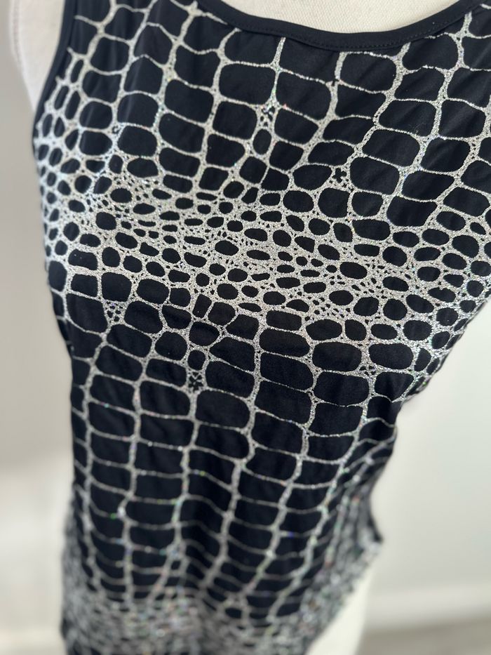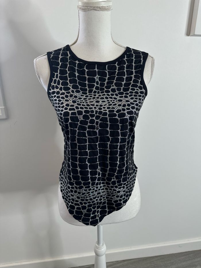 Débardeur crop top - Excellent état - Taille 36 équivalent S Dimensions en bas de l’annonce - Couleur noire et argenté holographique - Imprimés paillettes python serpent croco - Coupe asymétrique en pointe à l’avant - Fabrication française 🇫🇷 - Tissus stretch - Vintage années 80’ - Style Y2K, années 2000’ - Polyamide et élastane Dimensions: - 40 à 45cm niveau aisselle - Jusqu’à 55cm de long