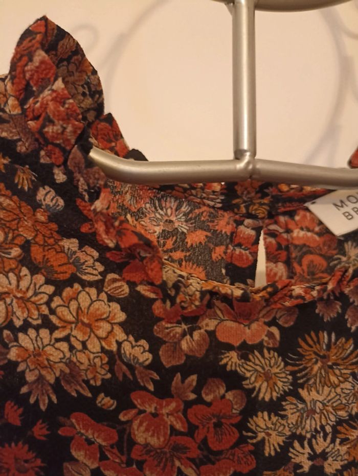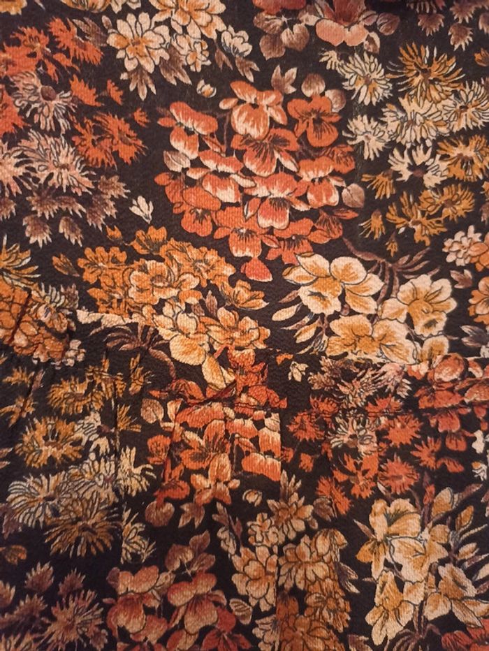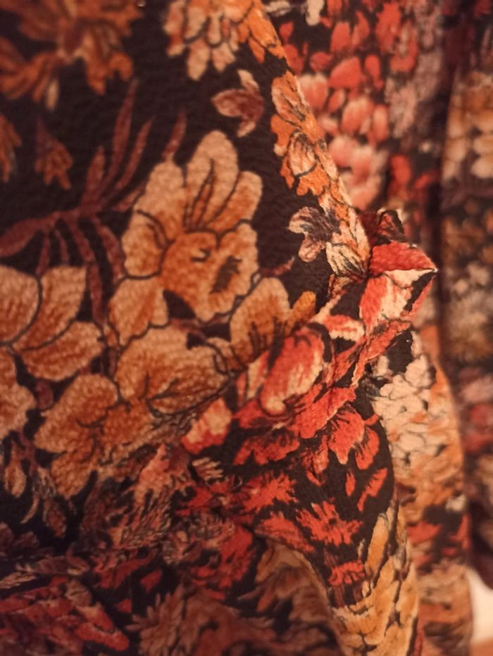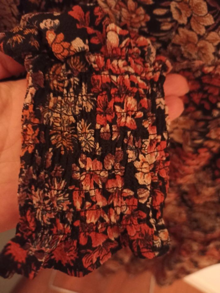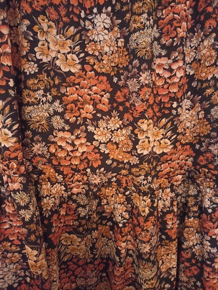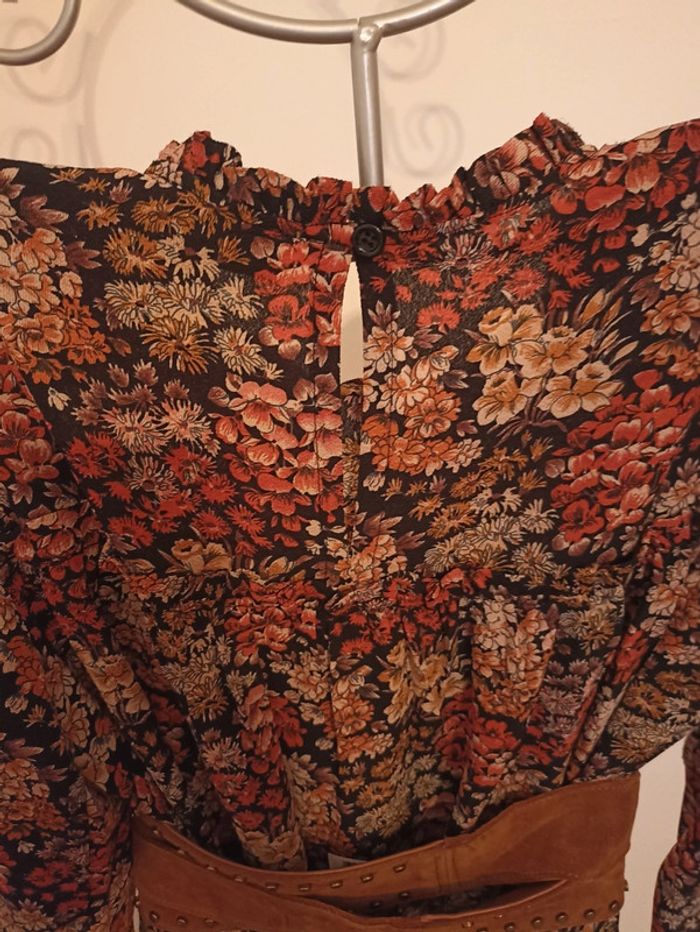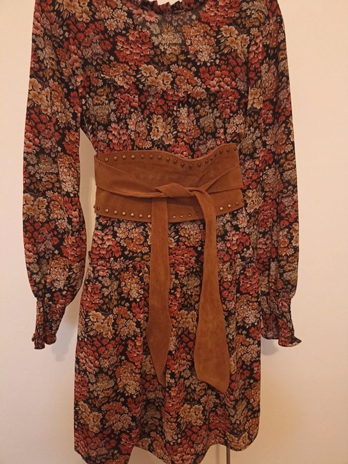 Magnifique robe en couleur marron, rouille et beige. Motif floral Empiècement froncé dans le bas de la robe, à la poitrine. Col froncé . Manches smockées Se porte avec ou sans ceinture (ceinture non vendue) Taille S convient aussi pour un 38. Parfait pour la mi-saison En parfait état. Aucun défaut