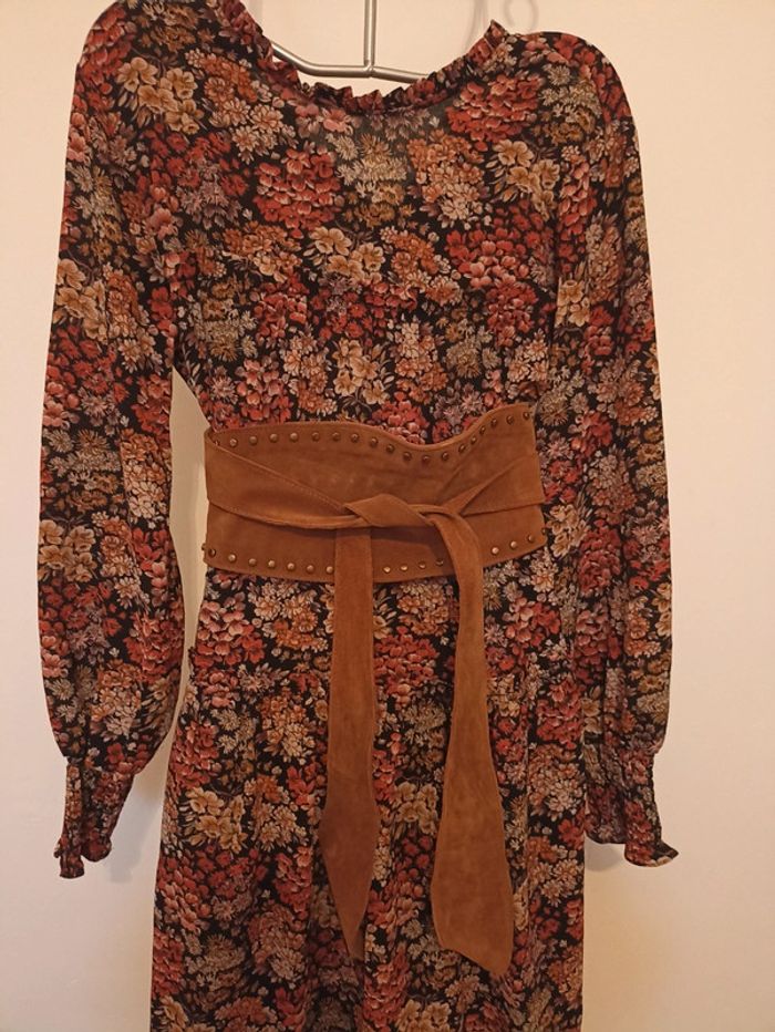 Magnifique robe en couleur marron, rouille et beige. Motif floral Empiècement froncé dans le bas de la robe, à la poitrine. Col froncé . Manches smockées Se porte avec ou sans ceinture (ceinture non vendue) Taille S convient aussi pour un 38. Parfait pour la mi-saison En parfait état. Aucun défaut