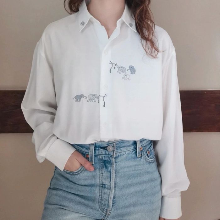💐 Réductions sur les lots 💐 2 articles : -5% 3 & 4 articles : -10% 5 articles et plus : -15% Pas d'envoi Vinted go, merci ✨ Chemisier blanc manches longues léger, broderies éléphanteaux col et poitrine Marine Paris 100% viscose État impeccable Taille 46 ok porté oversized, je le porte sur une taille 36 sur la photo 📏 Dimensions à plat : carrure 46cm, largeur poitrine 56cm, longueur 67cm ⚠️ Étant une entreprise déclarée payant des charges, merci de respecter mon travail en ne le bradant pas 🙏 #desibellesfripes46