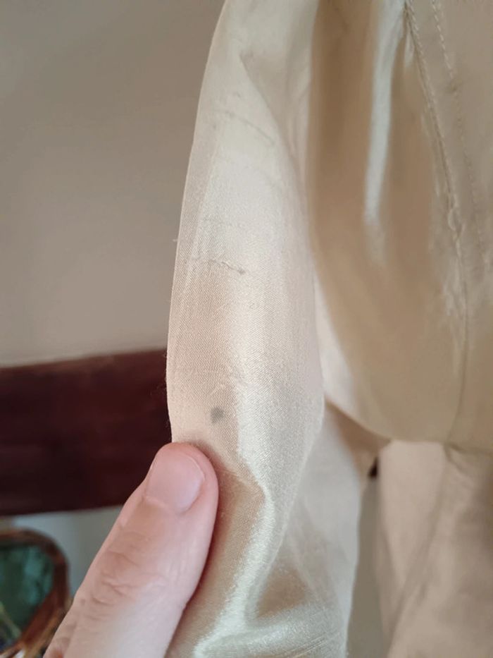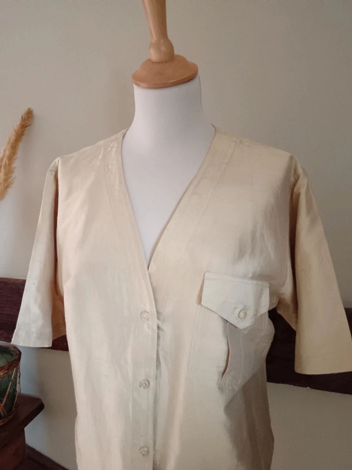 💐 Réductions sur les lots 💐 2 articles : -5% 3 & 4 articles : -10% 5 articles et plus : -15% Pas d'envoi Vinted go, merci ✨ Chemise manches courtes boutonnée à col V et poche poitrine Coupe cintrée avec possibilité de nouer un petit lien dans le creux du dos Absence d'étiquette matière, sûrement du polyester, matière épaisse opaque À noter une petite tâche semblant être de l'encre sur la manche droite, voir la dernière photo Taille 40/42 Je la porte sur un 36 sur la photo et mesure 1m61 📏 Dimensions à plat : carrure 42cm, largeur poitrine 50cm, longueur 59cm ⚠️ Étant une entreprise déclarée payant des charges, merci de respecter mon travail en ne le bradant pas 🙏 #desibellesfripes40