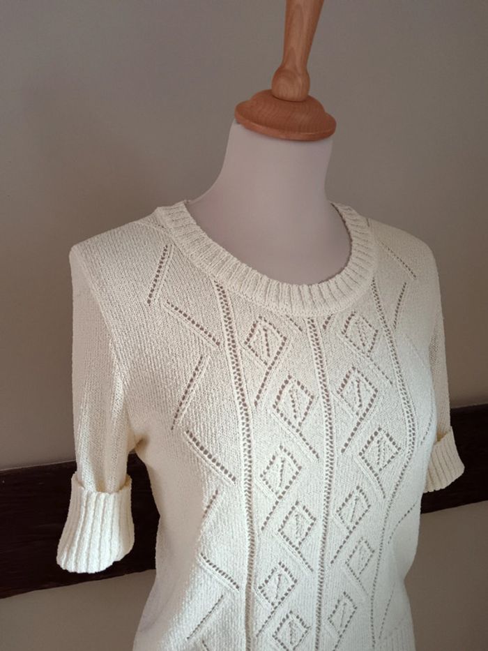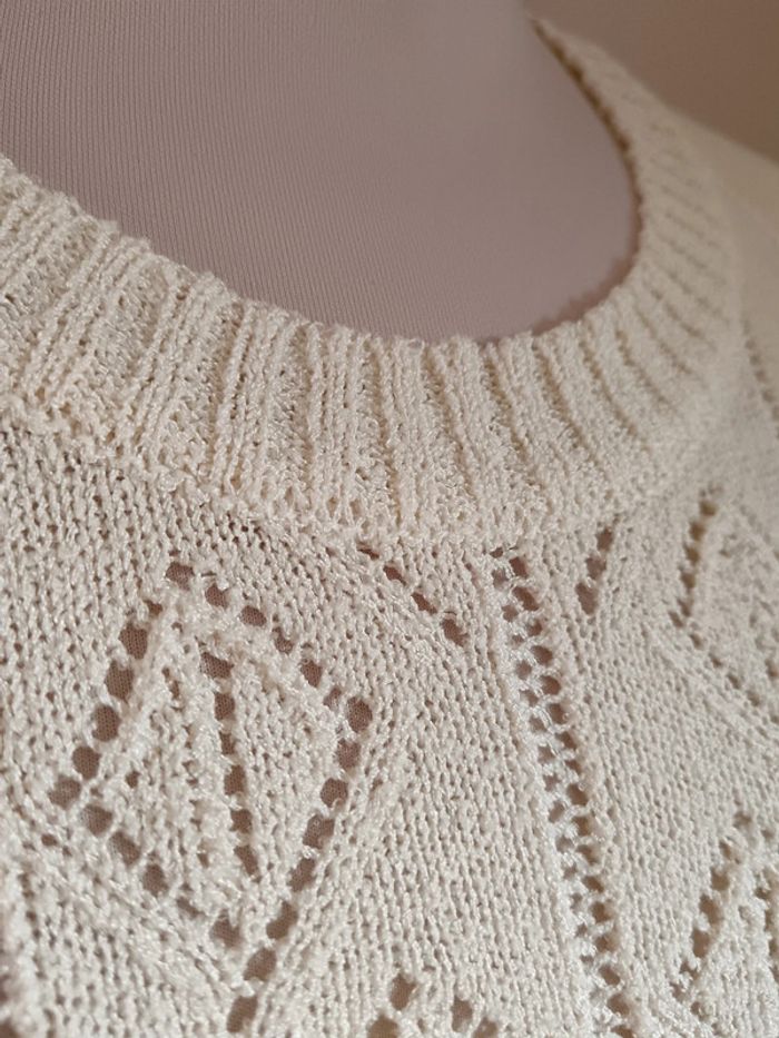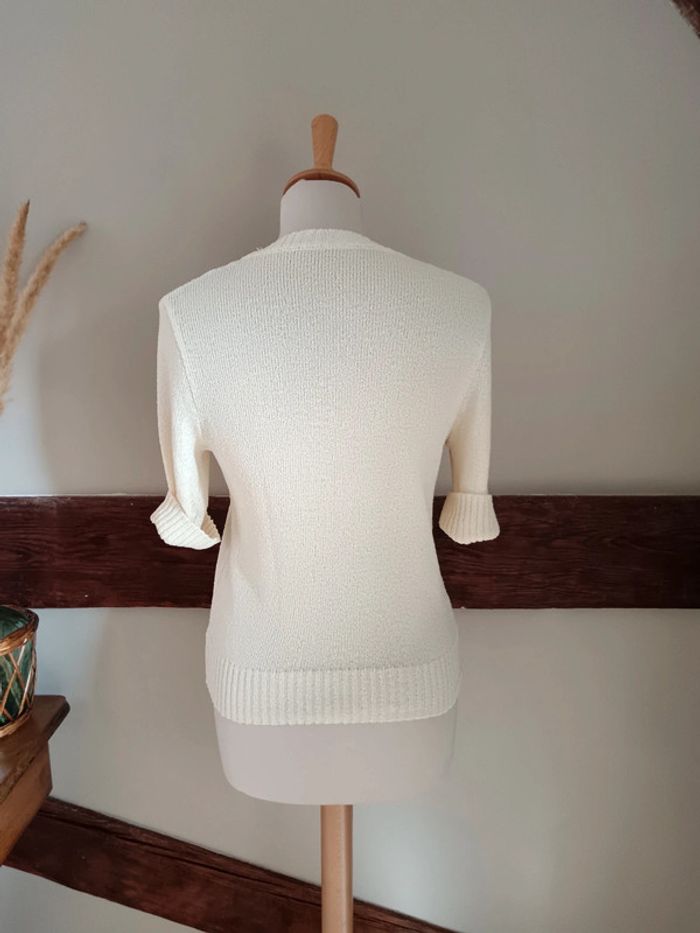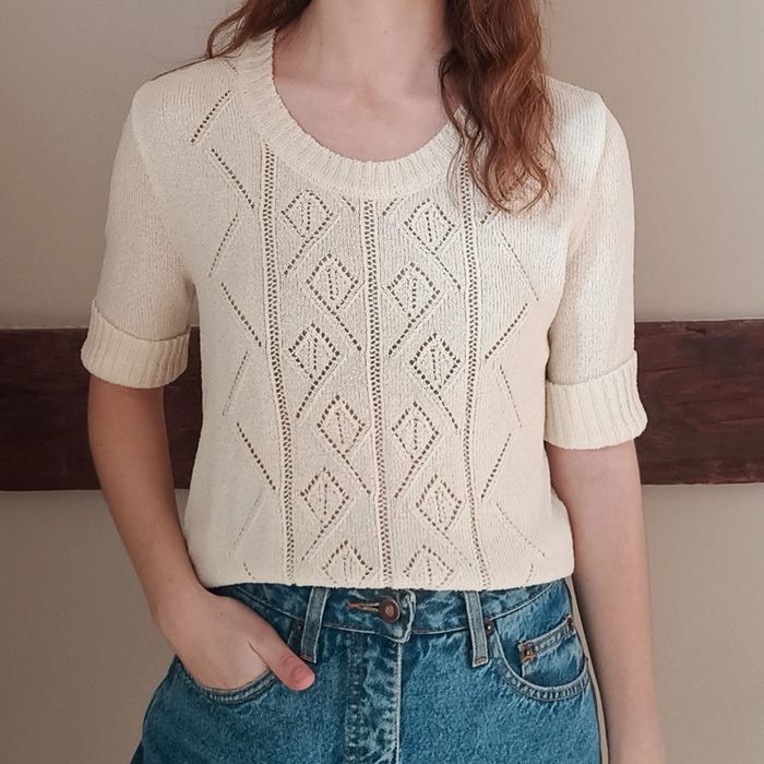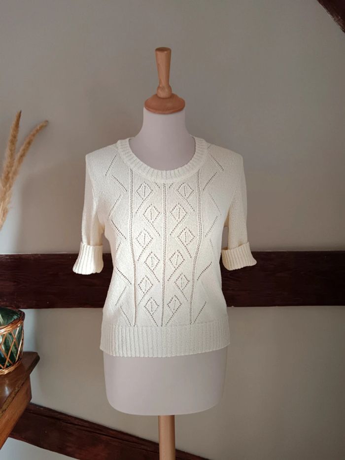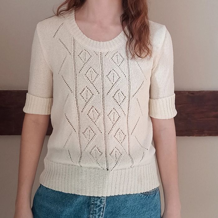 Pas d'envoi Vinted go ni UPS, merci - ✨ T-shirt manches courtes en maille fine crème à détails géométriques ajourés Fil chavanoz France, années 80 84% triacétate 16% polyalide Très bon état Taille 36 Je le porte sur un 36 sur les photos et mesure 1m61 📏 Dimensions à plat : carrure 36cm, largeur poitrine extensible jusqu'à 49cm, longueur 57cm ⚠️ Étant une entreprise déclarée payant des charges, merci de respecter mon travail en ne le bradant pas 🙏 #desibellesfripes36