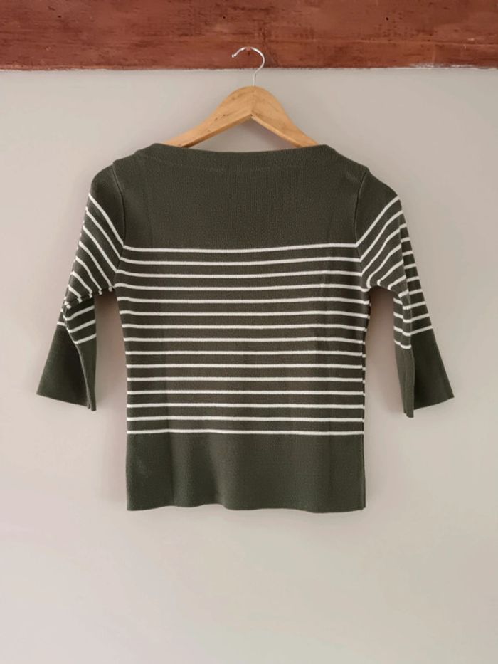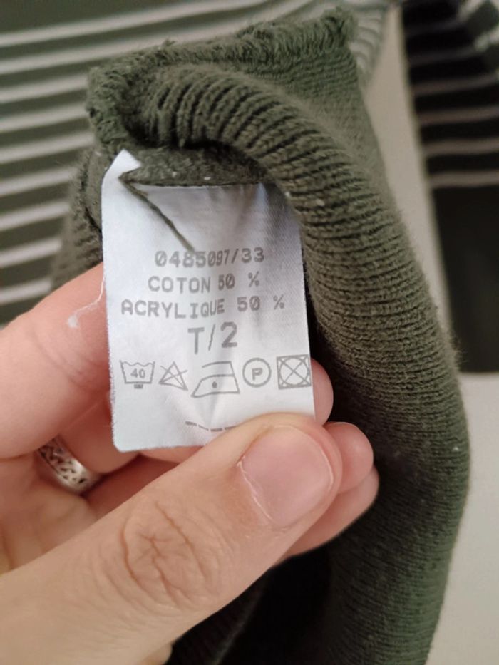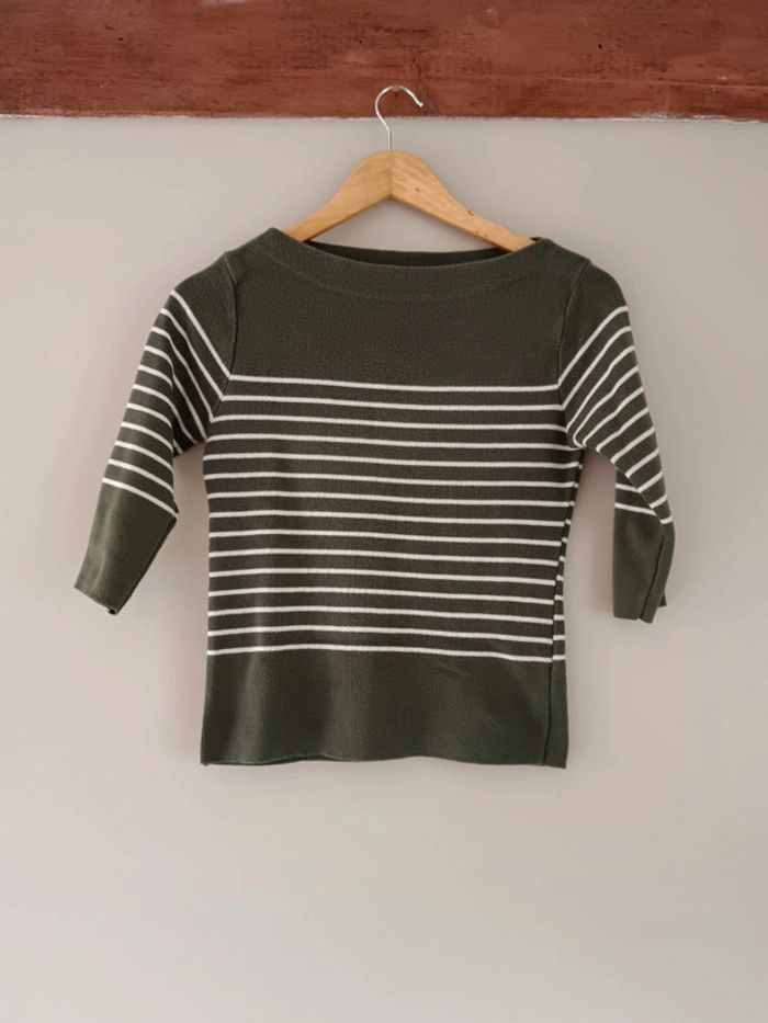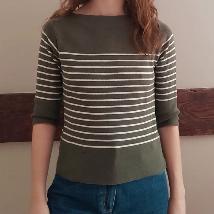 💐 Réductions sur les lots 💐 2 articles : -5% 3 & 4 articles : -10% 5 articles et plus : -15% Pas d'envoi Vinted go, merci ✨ Petit pull marinière vert kaki rayé blanc à col bateau et manches 3/4, coupe proche du corps 50% coton 50% acrylique Très bon état Taille 2 sur étiquette mais conviendra plutôt à une taille 34 ou 36 actuelle Je le porte sur un 36 sur les photos et mesure 1m61 📏 Dimensions à plat : carrure 36cm, largeur poitrine extensible jusqu'à 48cm, longueur 50cm Retrouve moi porté en vidéo sur Instagram pseudo : de_si_belles_fripes ⚠️ Étant une entreprise déclarée payant des charges, merci de respecter mon travail en ne le bradant pas 🙏🏻 #desibellesfripes36
