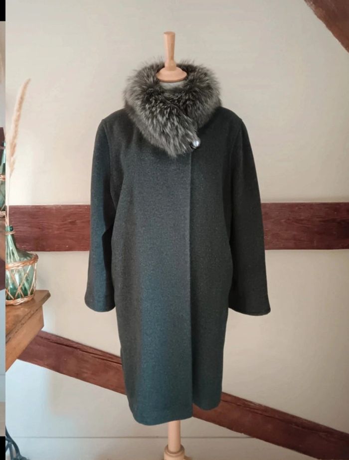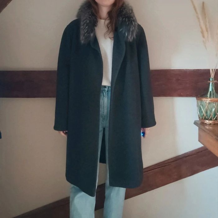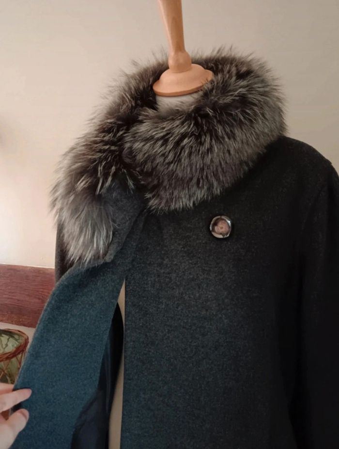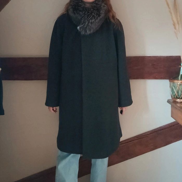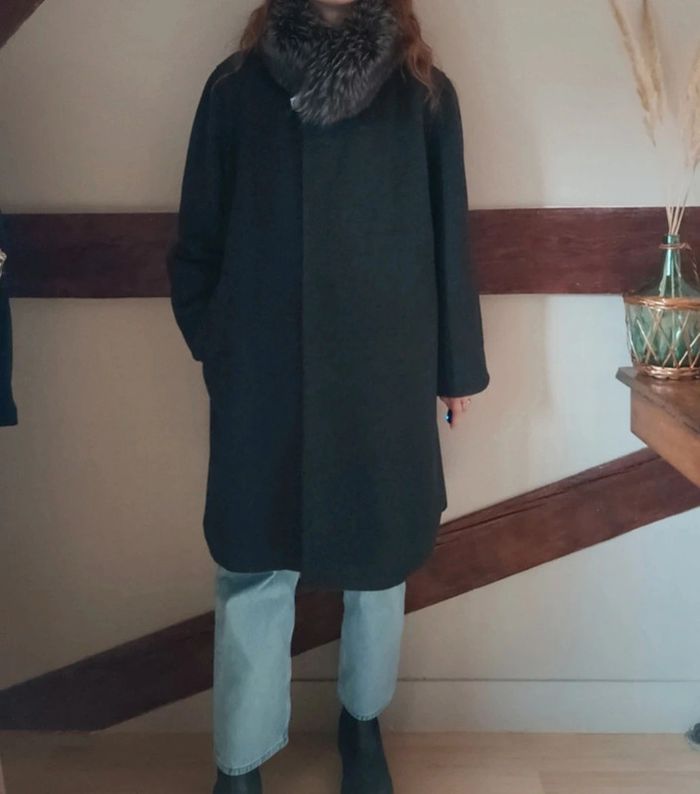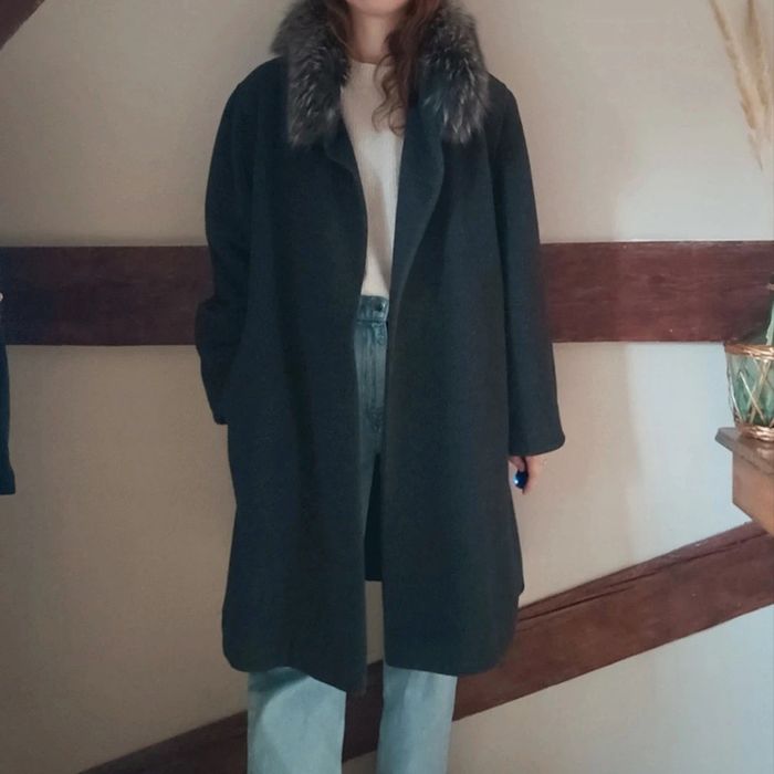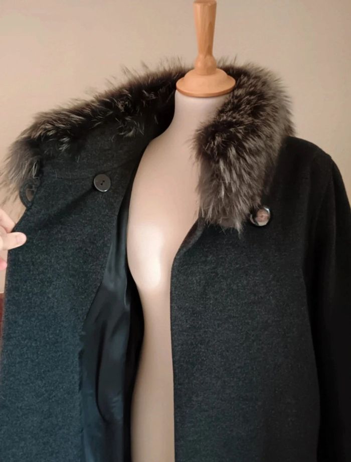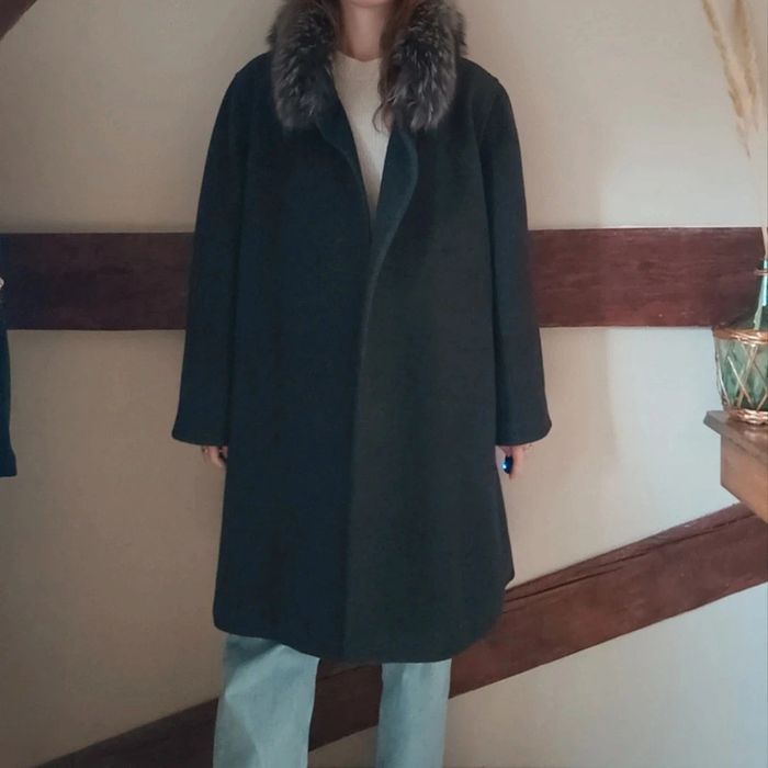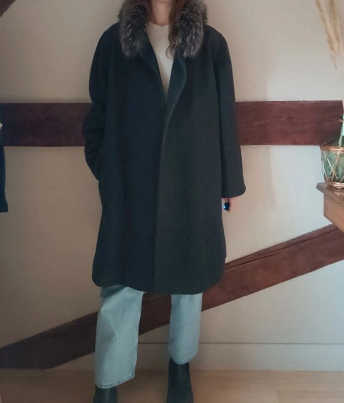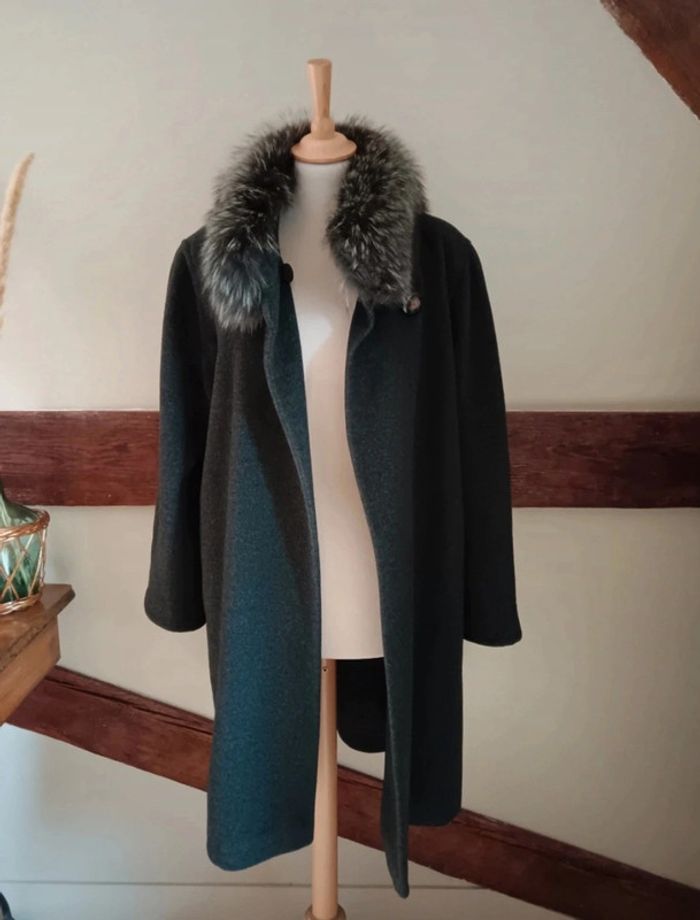 Pas d'envoi Vinted go, merci - ✨ Superbe manteau mi-long gris foncé presque noir à col en fausse fourrure noir et gris cendré, épaulettes intégrées Manteau ample oversize à manches larges se fermant grâce à un bouton au col Maryvonne Caen, années 70 Toucher laine mélangée à un peu de cachemire, lainage très chaud Superbe qualité et parfait état Taille 42 estimée, je le porte sur un 36 sur les photos et mesure 1m61 📏 Dimensions à plat : carrure 44cm, largeur poitrine 56cm, manches 58cm, longueur 94cm ⚠️ Étant une entreprise déclarée payant des charges, merci de respecter mon travail en ne le bradant pas 🙏 #desibellesfripes42