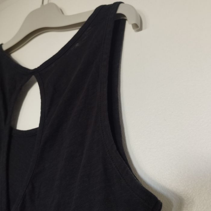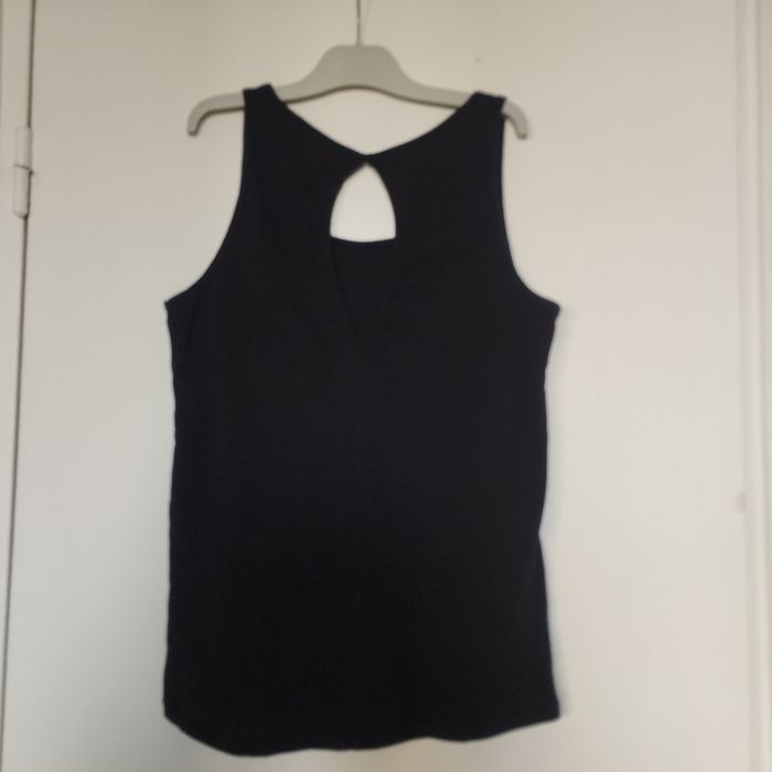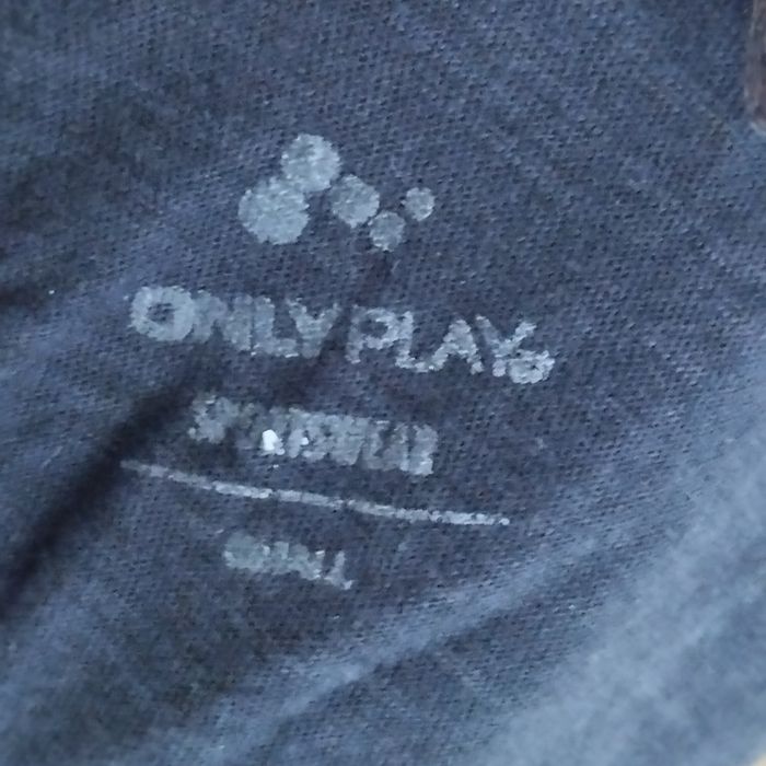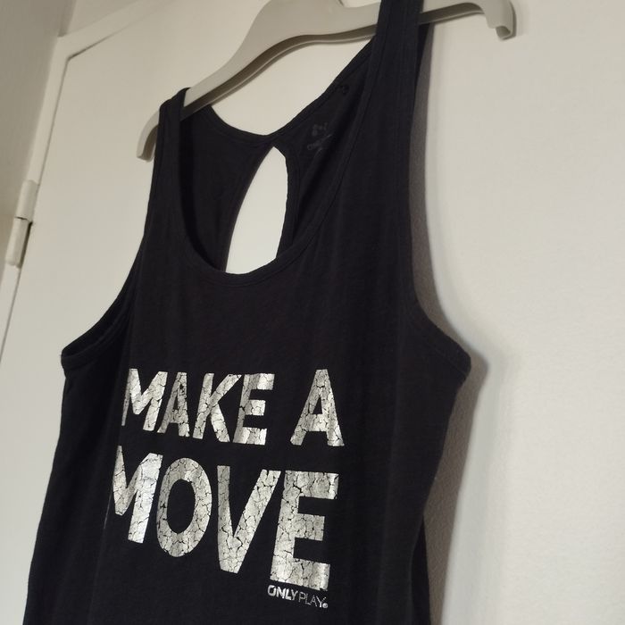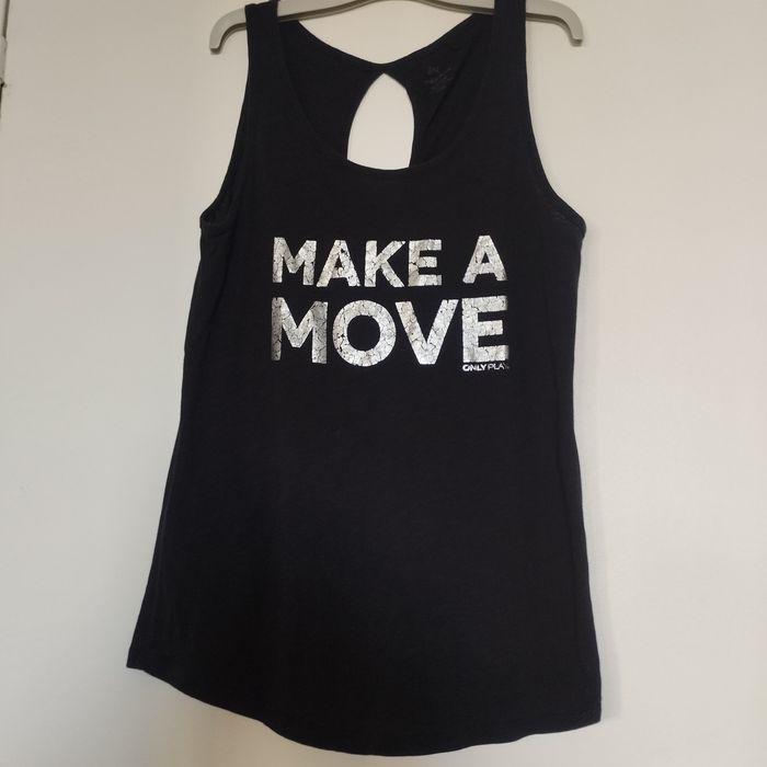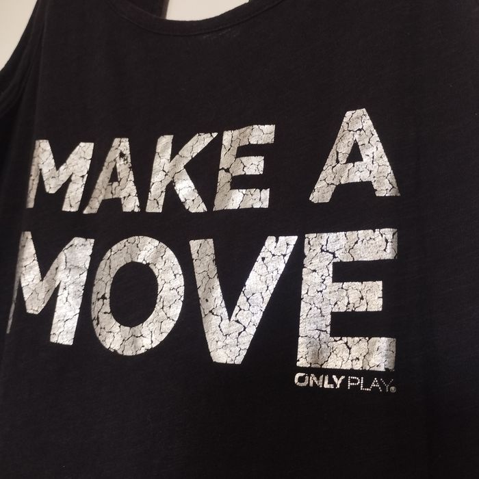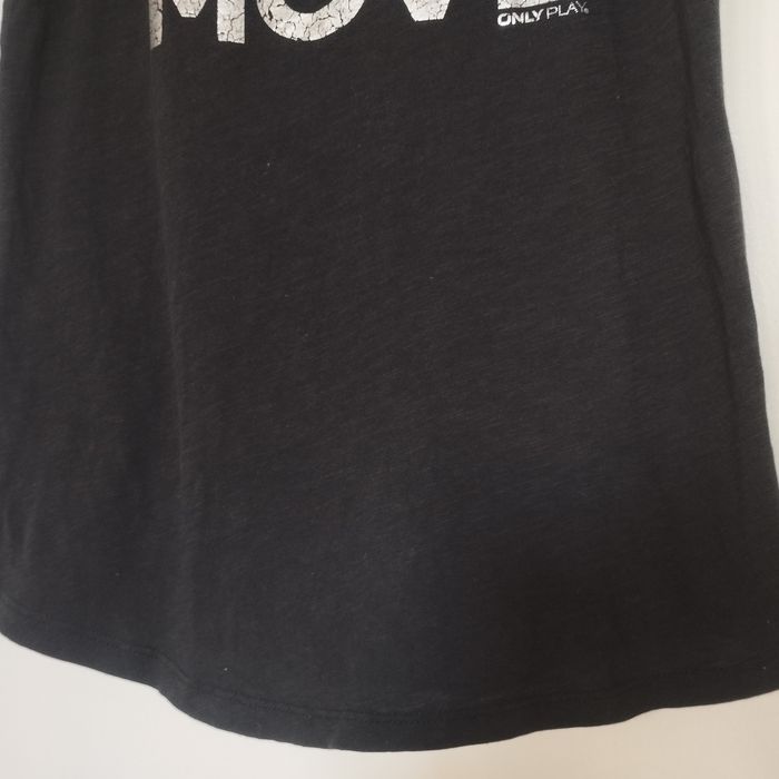 T-Shirt débardeur femme de Only Play, taille S. Couleur Noir et imprimé plastifié argenté. Longueur 64cm, Aisselle à Aisselle 42cm.